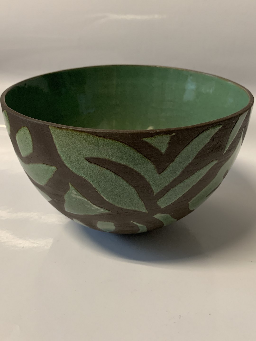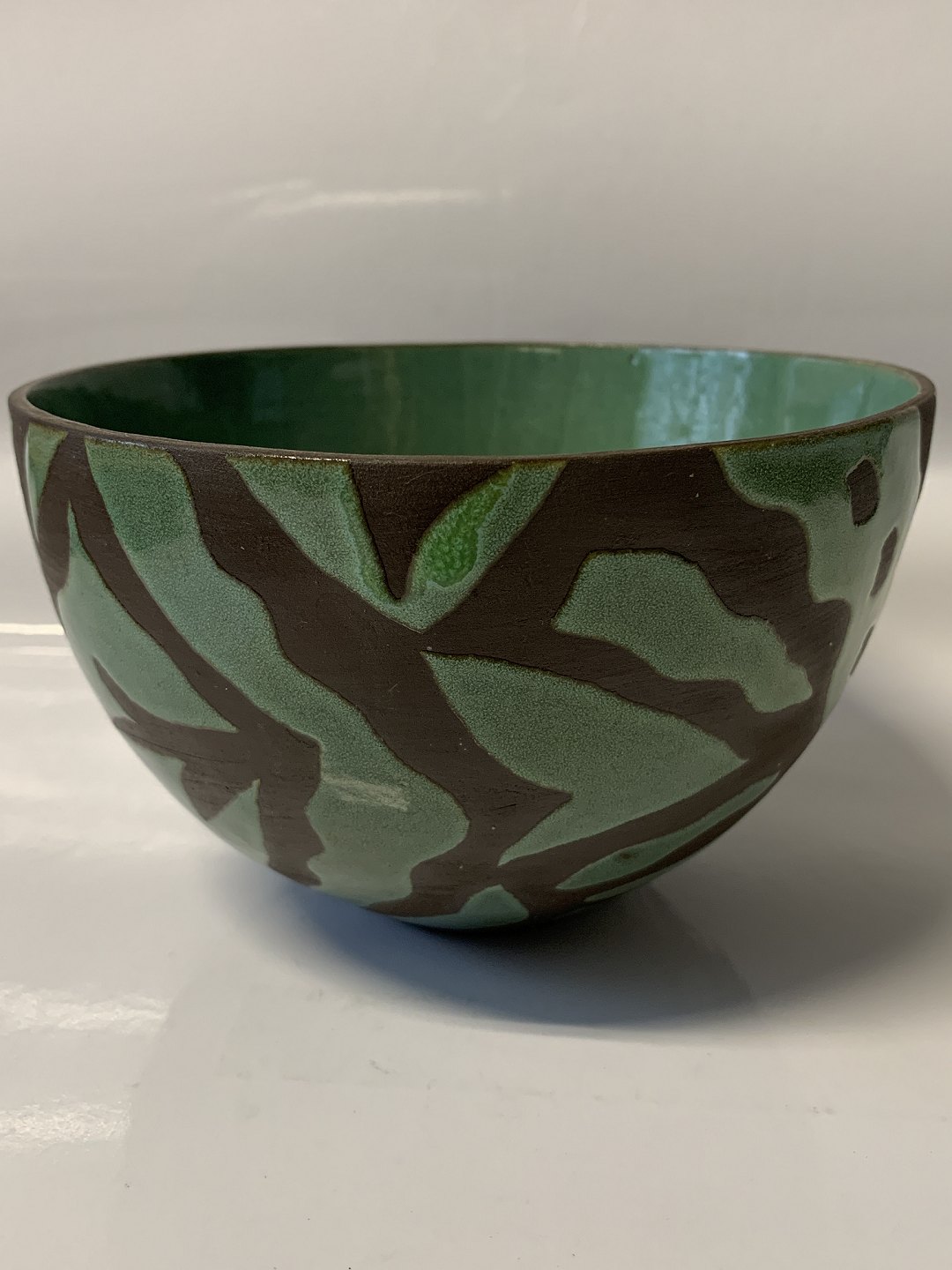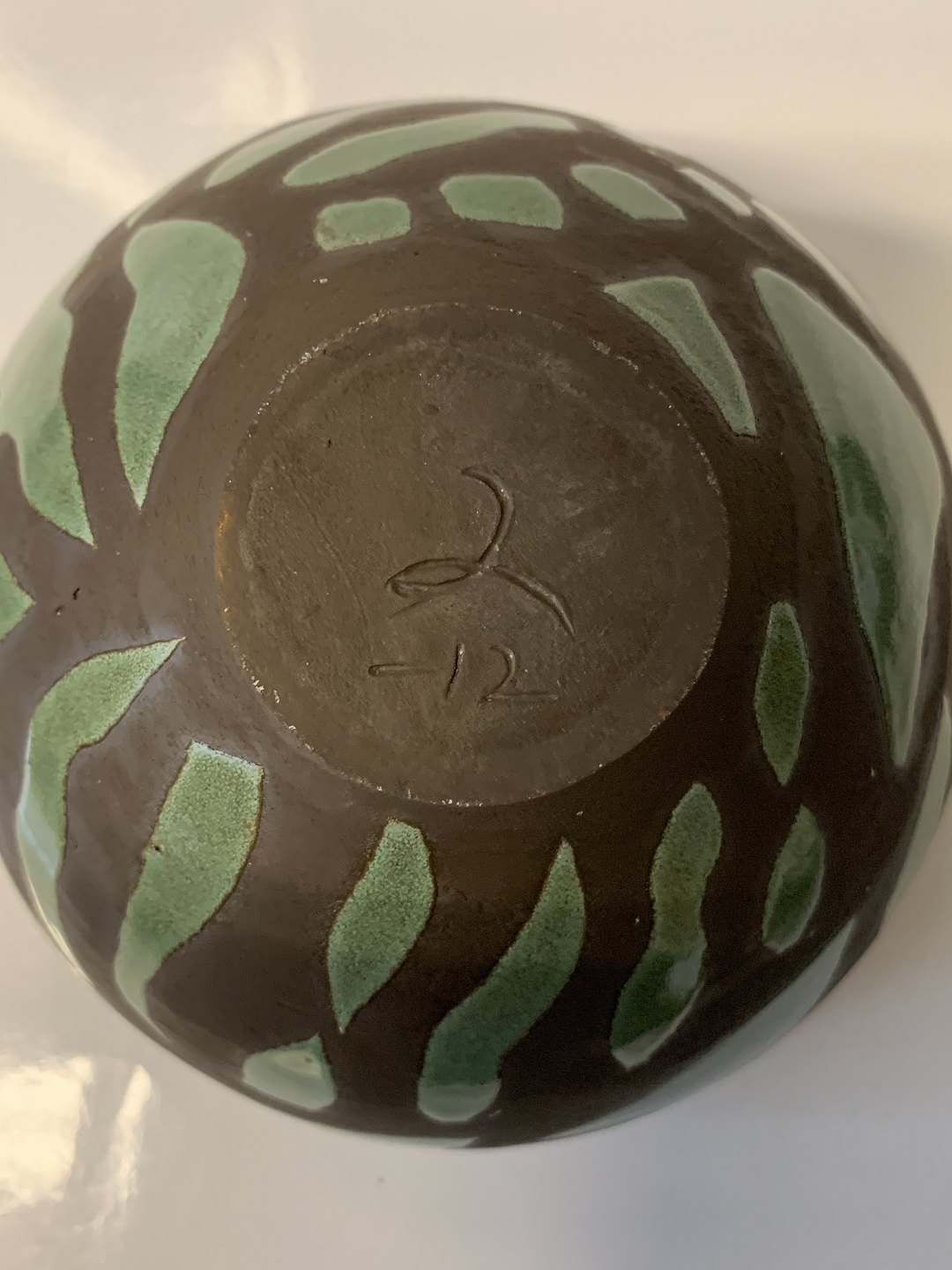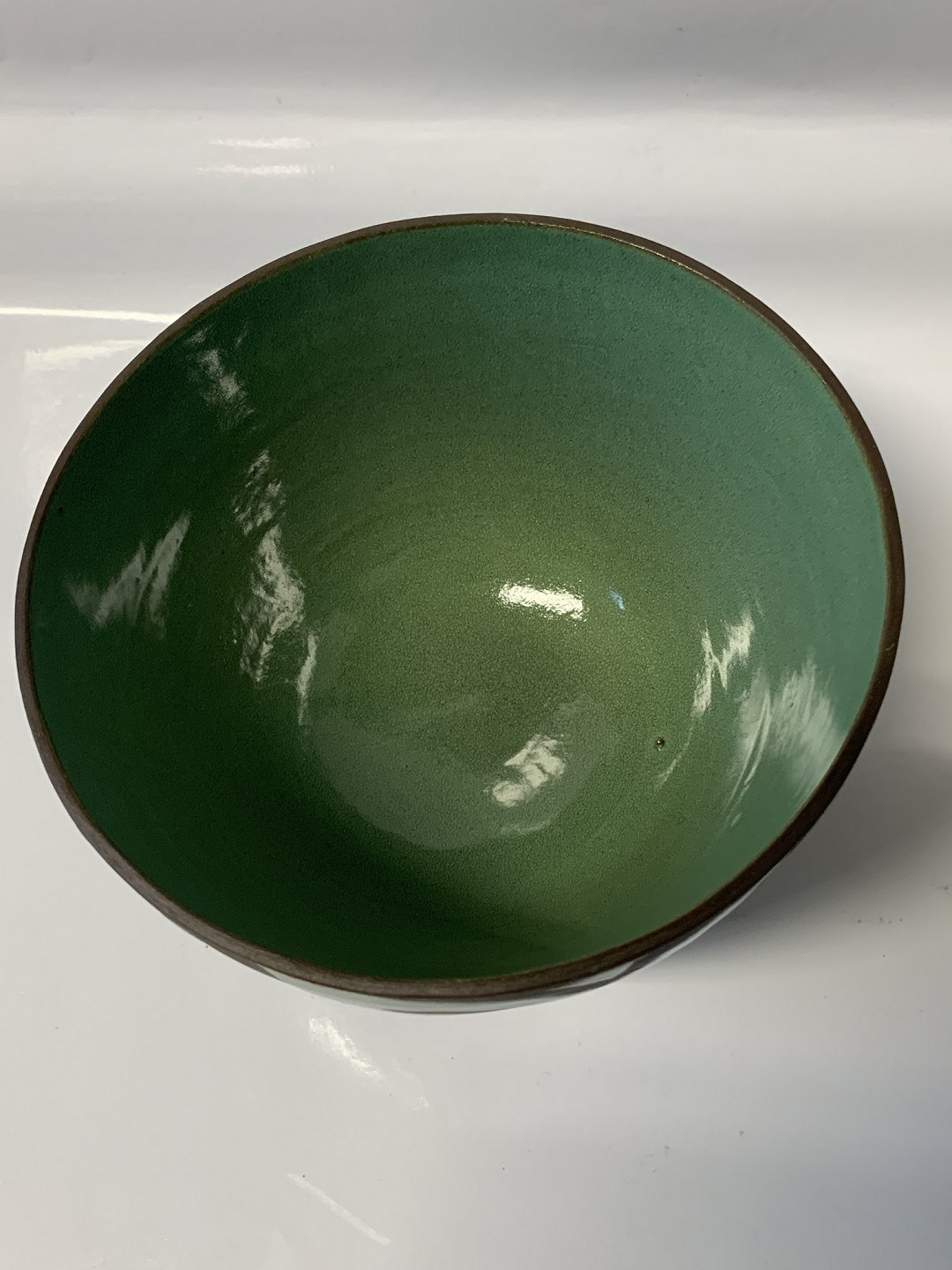 Ceramic glazed bowl, in green and brown colours. Height: 9.6 cm. Diameter: 15.5 cm. Is complete and in good condition.