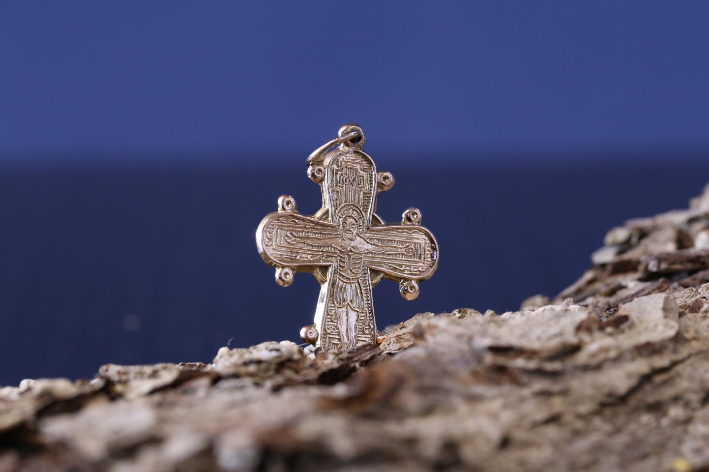 Classic Day of the Dead cross with the suffering Jesus on the front, and the 5 large ones on the back. The Day of the Dead cross is a classic gold piece of jewelry that can be worn by both men and women.