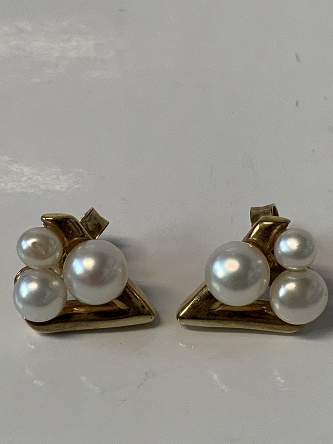 8 karat guld Øreringe med Perler. Stemplet JAa 333. Bredde 1 cm. Længde 1,4 cm. Pæn og velholdt. Smykket tjekket af guldsmed Varen findes ikke fysisk i butikken, kontakt os for fremvisning.