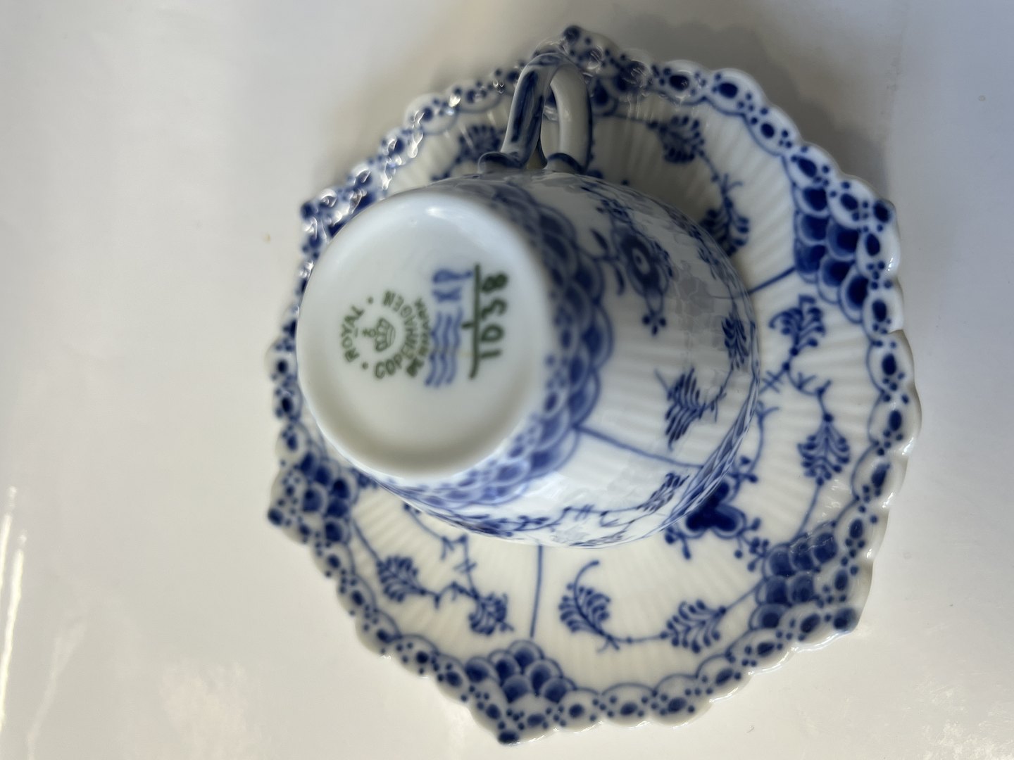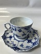 Royal Copenhagen Musselmalet Helblonde, lille espressokop med tilhørende underkop. Dekorationsnummer 1/1038. 2. sortering. Koppens diameter er 6,0 cm., højde 5,4 cm. Perfekt stand uden fejl.