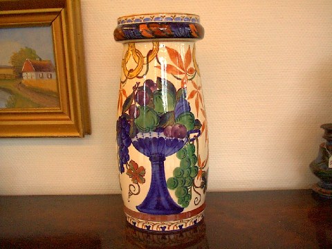 Large Aluminia Faiance Vase with Parrot, decoration number 571/554, it has small hairline cracks.