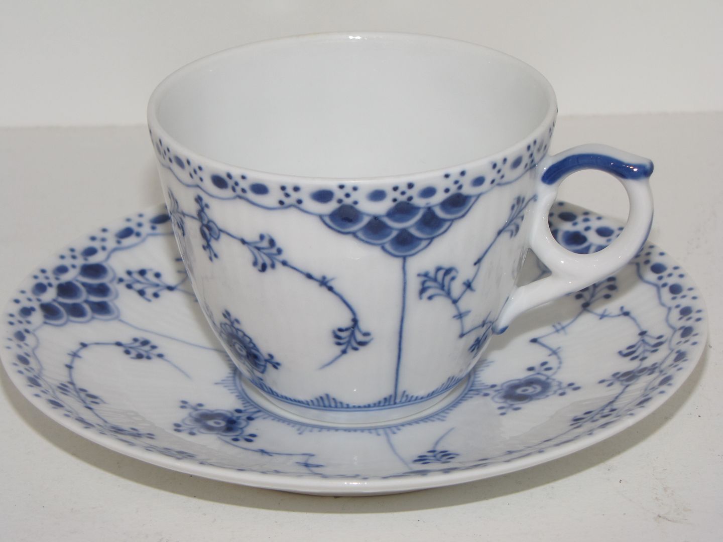 Royal Copenhagen Blue Fluted Half Lace, large coffee cups with saucers.