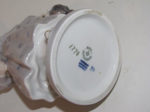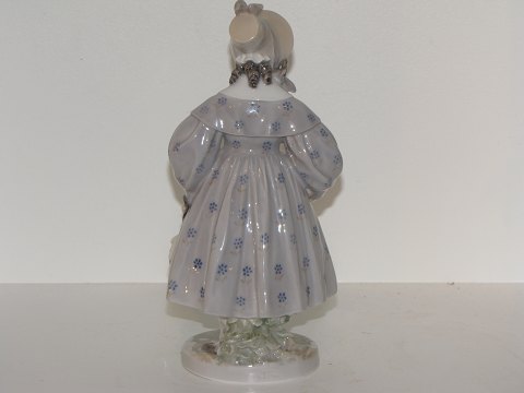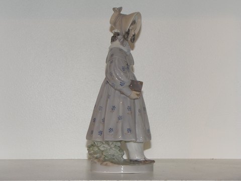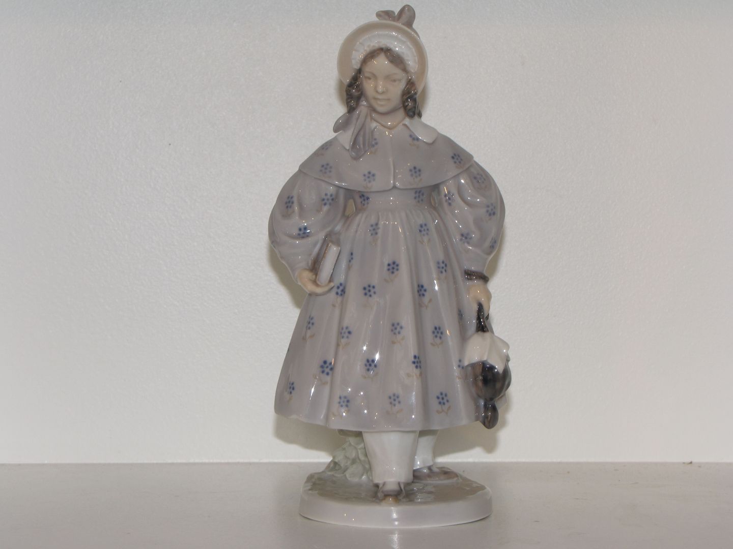 Royal Copenhagen Art Nouveau, sjælden figur af pige i fin frakke med parably og bog.