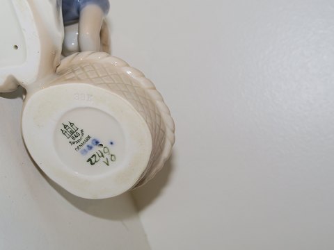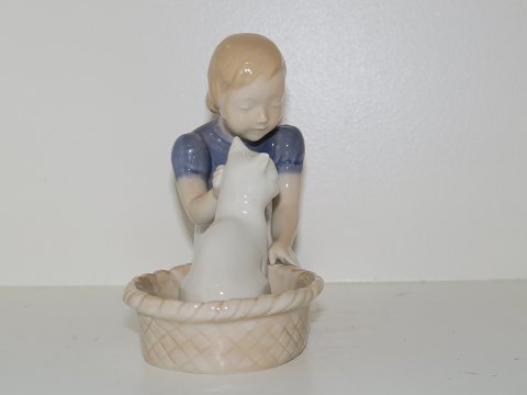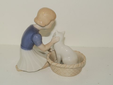Bing & Grøndahl figur, pige med hvid kattekilling i kurv. Af fabriksmærket ses det, at denne er produceret mellem 1962 og 1970. Dekorationsnummer 2249. 1. sortering. Længde 11,5 cm. Perfekt stand uden fejl.