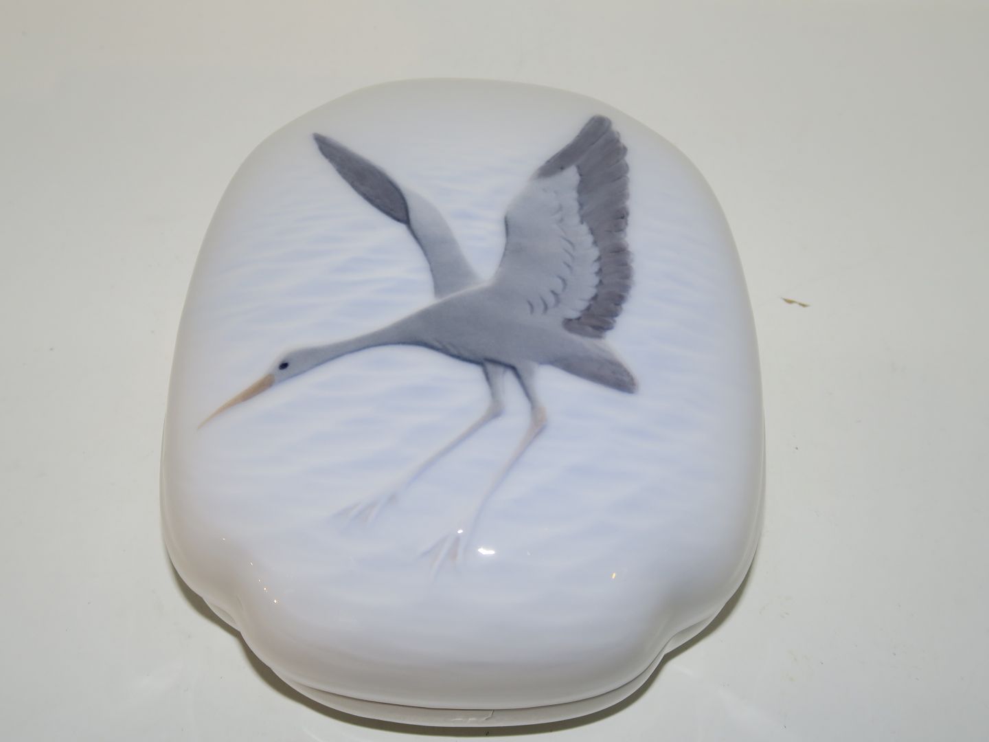 Royal Copenhagen Art Nouveau lidded bowl decorated with a heron on lid and flowers and insect on the inside.