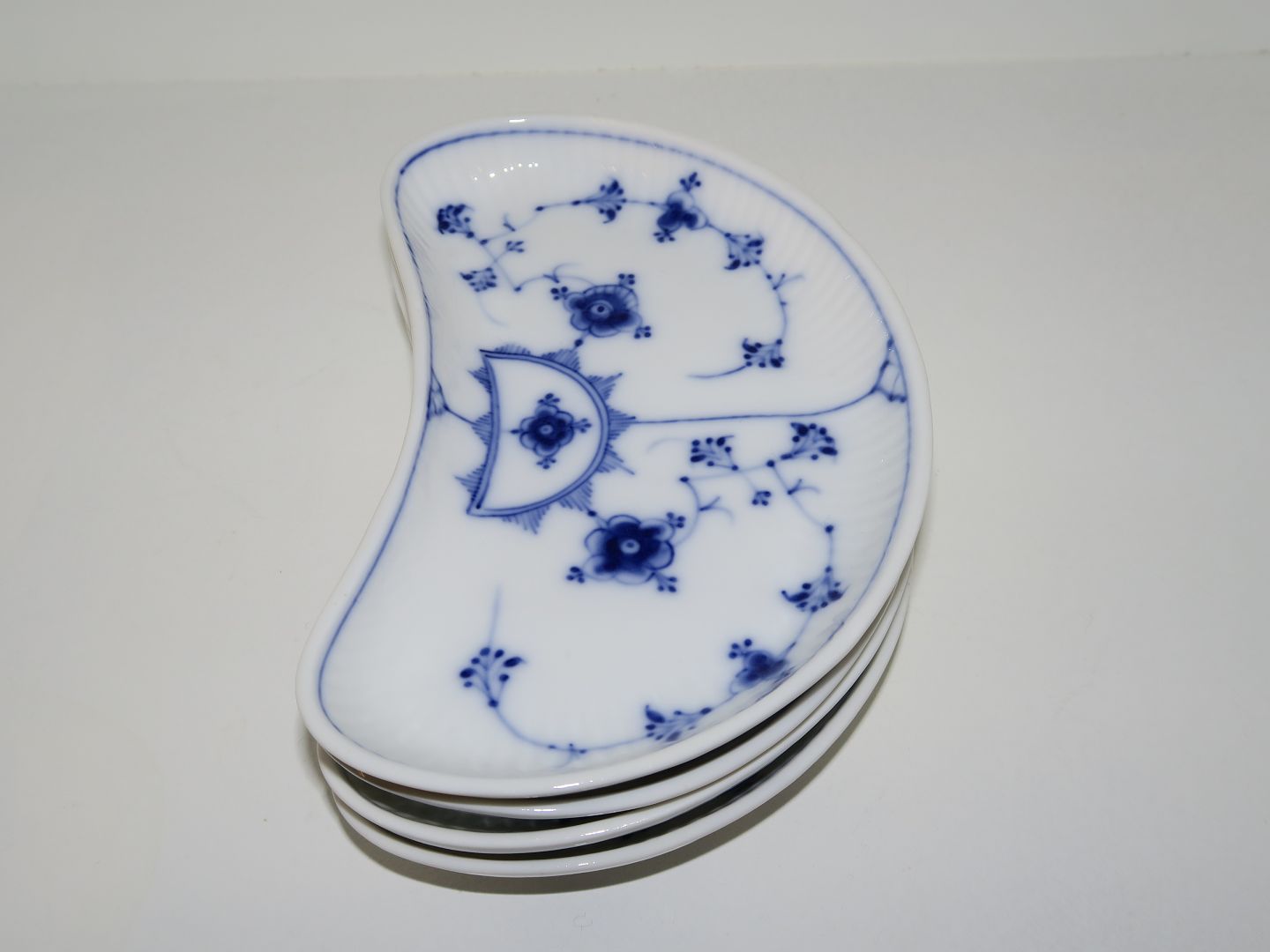 Bing & Grøndahl Blåmalet Riflet (Musselmalet Riflet), lille måneformet asiet. Af fabriksmærket ses det, at denne er produceret mellem 1915 og 1948. 1. sortering. Længde 17,0 cm. Perfekt stand uden fejl.
