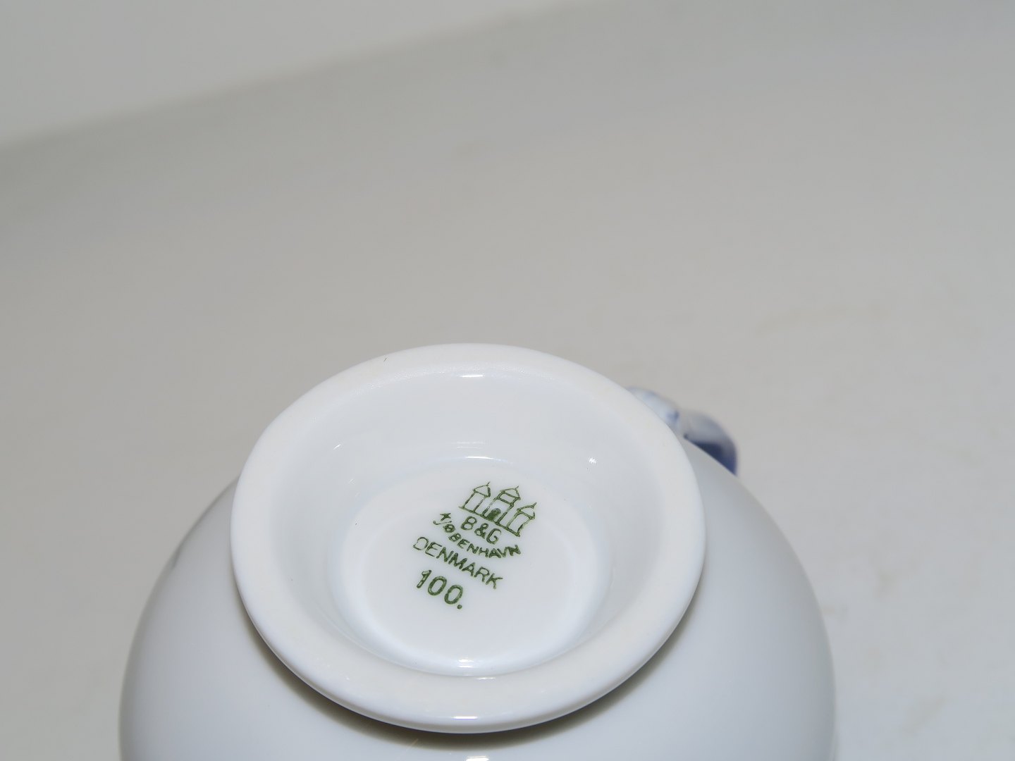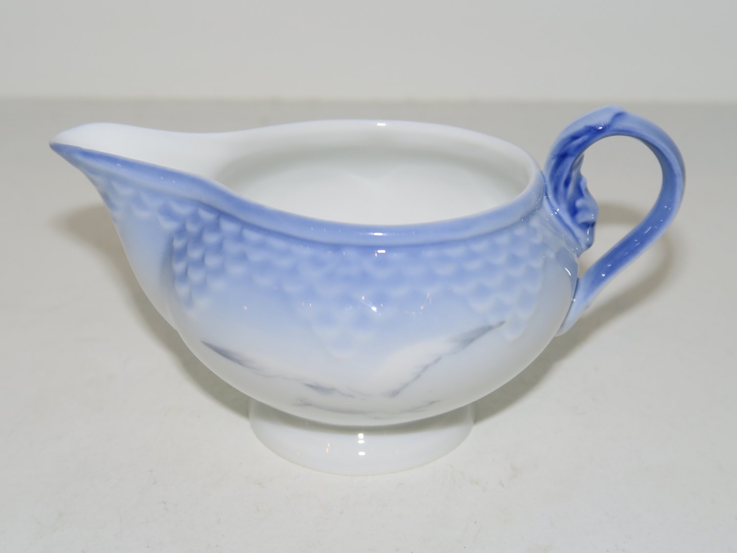 Bing & Grøndahl Måge uden guldkant, lille flødekande. Af fabriksmærket kan det udledes, at denne er produceret mellem år 1962 og 1970. Dekorationsnummer 100. 2. sortering. Længde 10,2 cm. Perfekt stand uden fejl.