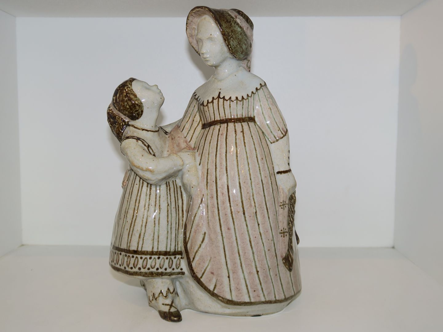 Større Bing & Grøndahl stentøjsfigur, mor og pige. Af fabriksmærket ses det, at denne er produceret mellem 1970 og 1983. Dekorationsnummer 206 JC. 1. sortering. Højde 25,5 cm. Perfekt stand uden fejl.