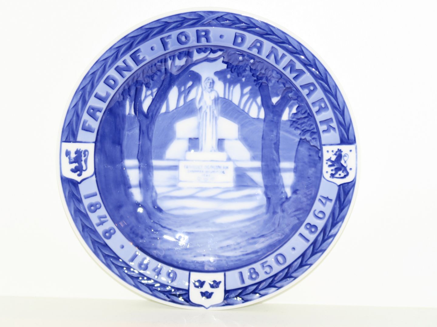 Royal Copenhagen Mindeplatte fra 1920. Mindeplatte for Faldne Frivillige for Danmark 1848 - 1849 - 1850 - 1864. Medarbejdersortering pga. lidt pletter i glasuren. Diameter 19,7 cm. Perfekt stand uden fejl.