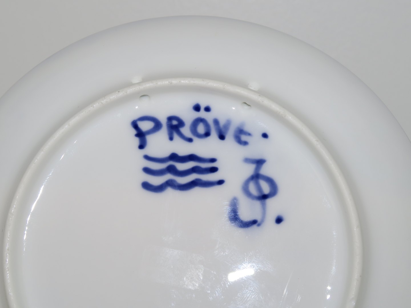 Denne er mærket "PRØVE" på bagsiden, og den er dermed et udkast, som Royal Copenhagen har lavet for at vurdere, om man skulle gå i gang med at producere juleplatter.