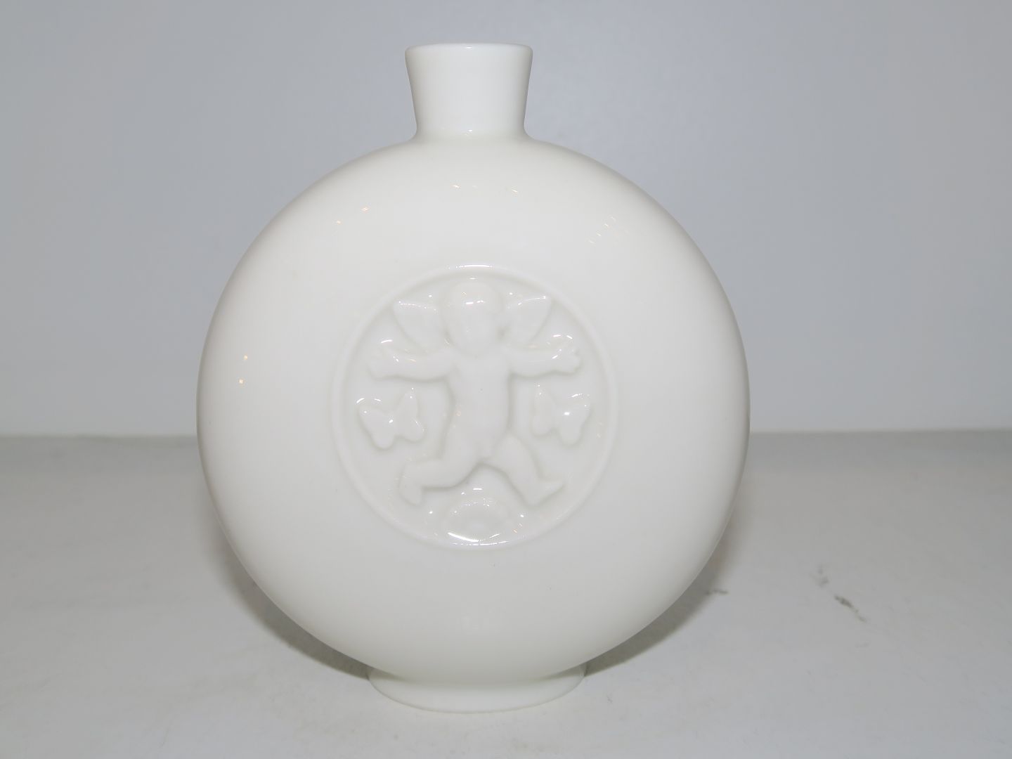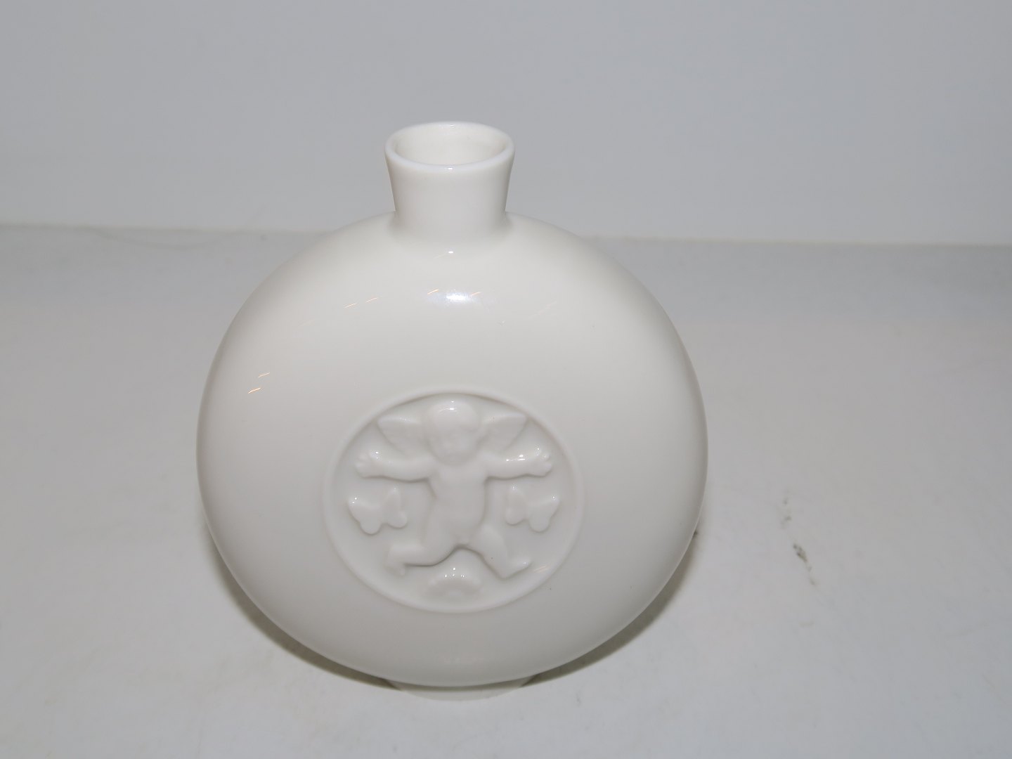 Royal Copenhagen blanc de chine porcelæn, hvid vase med låg dekoreret med en engel.
