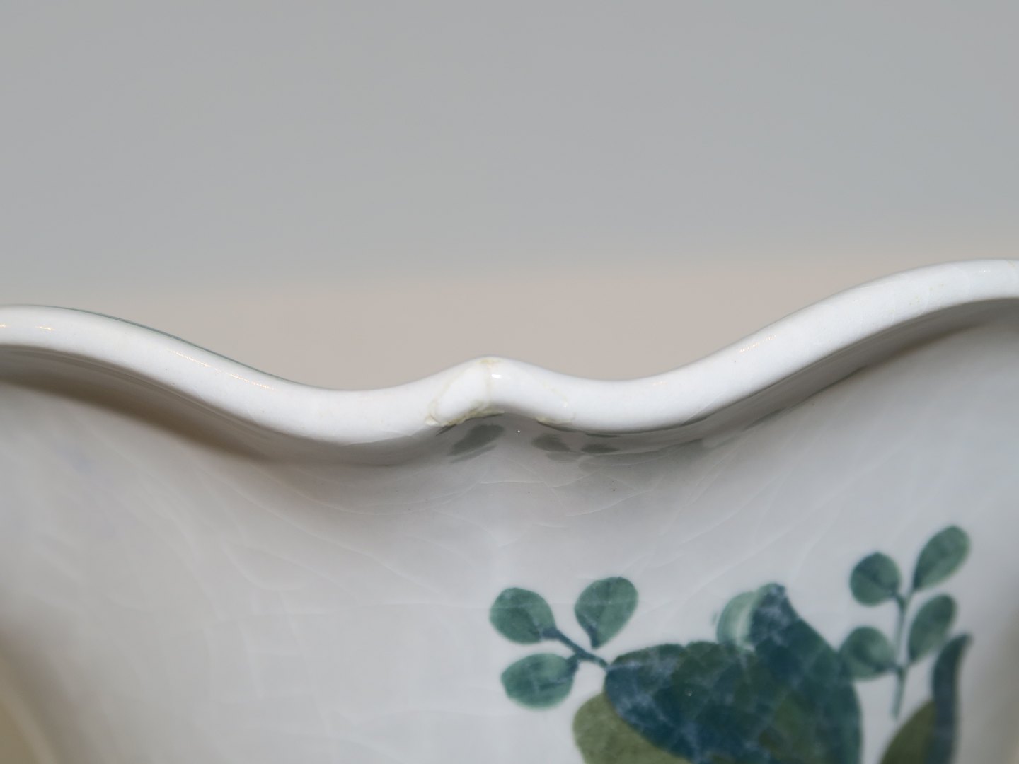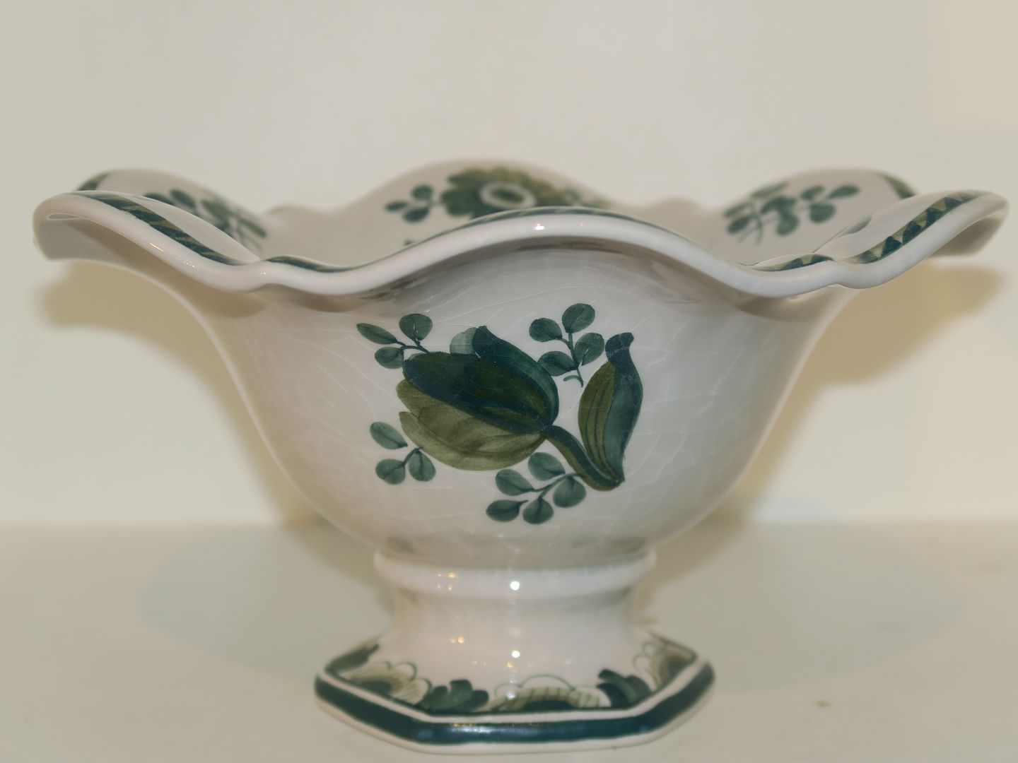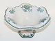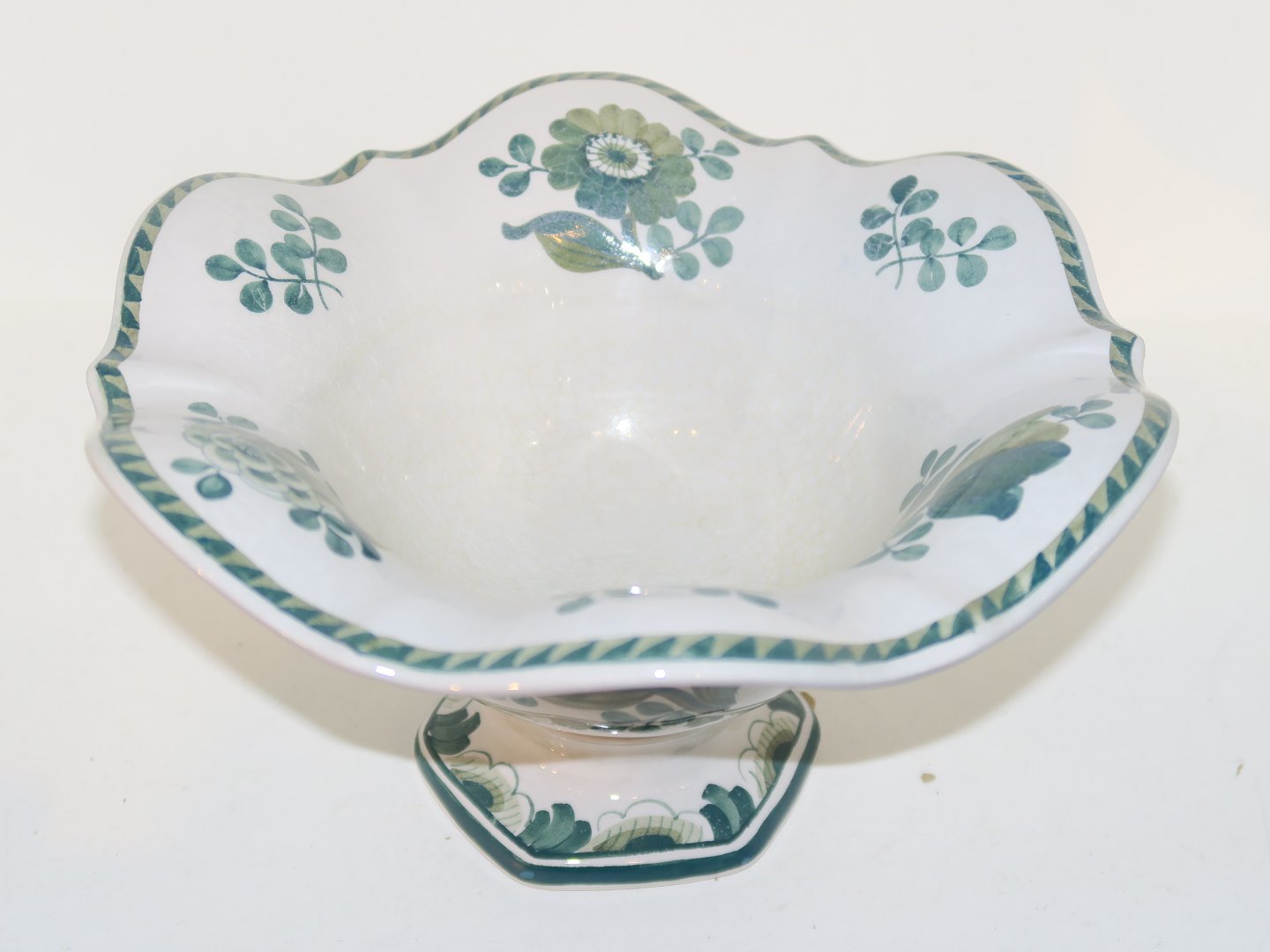 Aluminia green Tranquebar, rare bowl on stand. Decoration number 2087/1130. Factory first. Height 12.0 cm., diameter 21.5 cm. Has some crazing in glaze small chip underneath the top rim otherwise perfect condition.