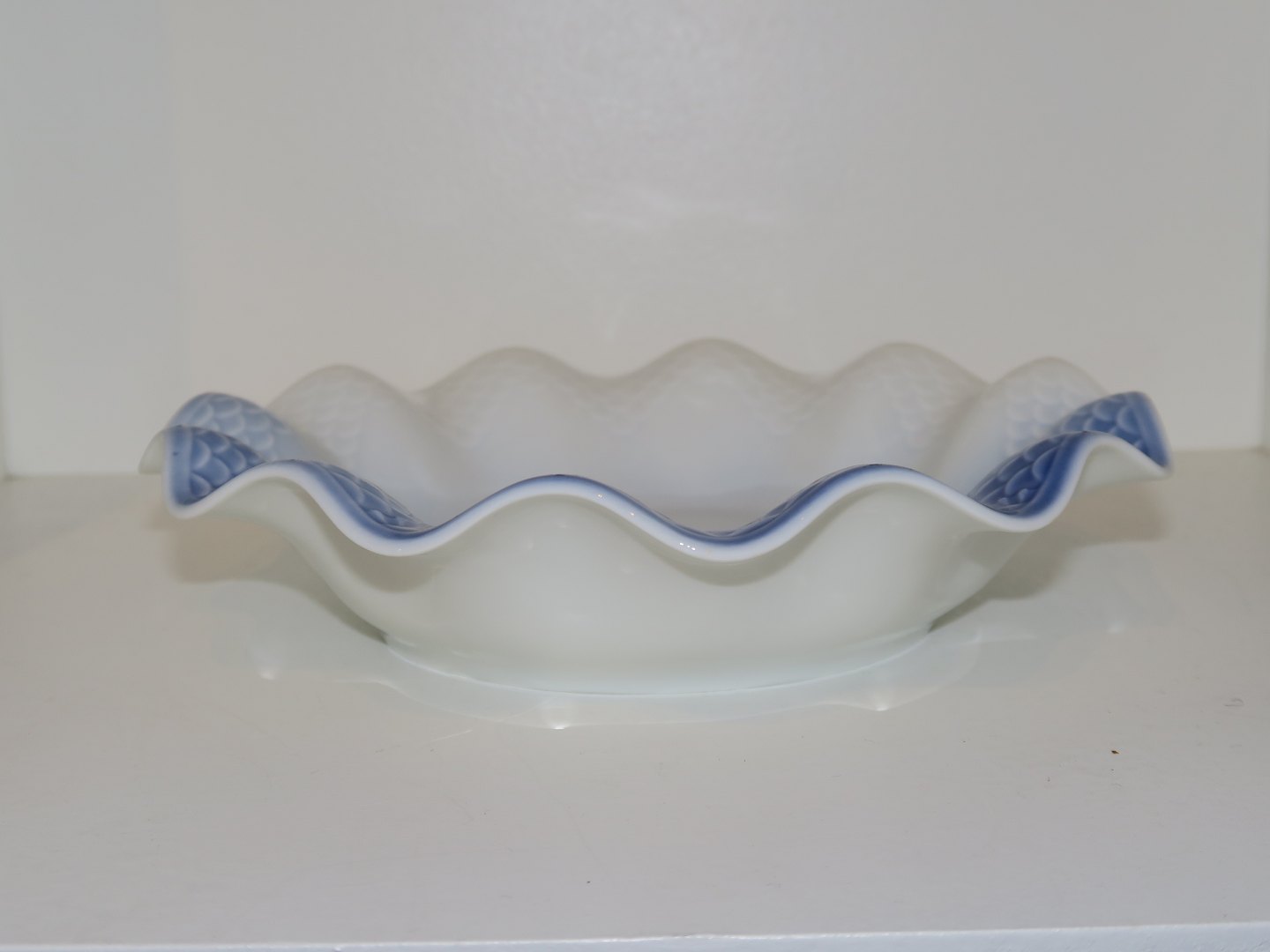 Bing & Grøndahl Måge uden guldkant, bølgeformet skål. Af fabriksmærket kan det udledes, at denne er produceret mellem 1962 og 1970. Dekorationsnummer 227. 2. sortering. Diameter 18.5 cm. Perfekt stand uden fejl.
