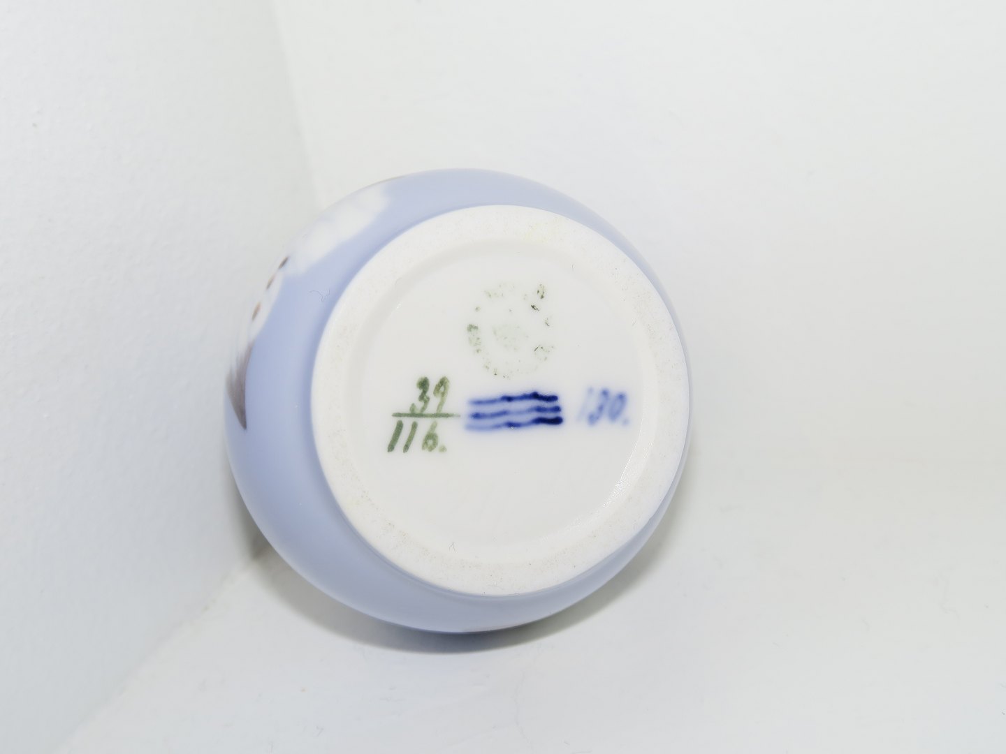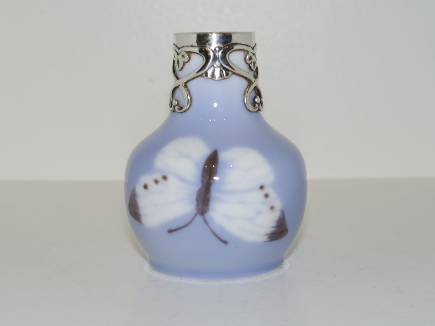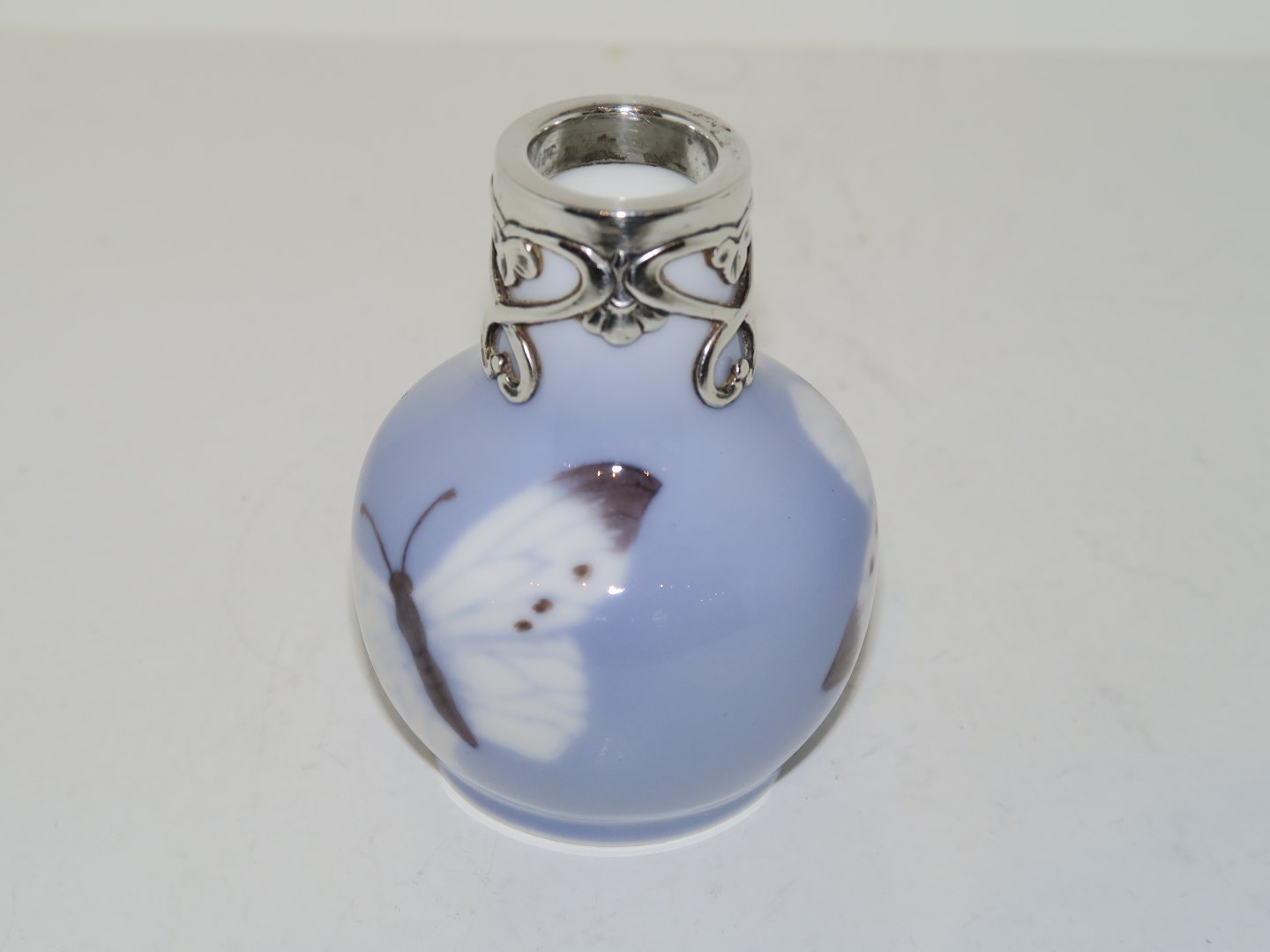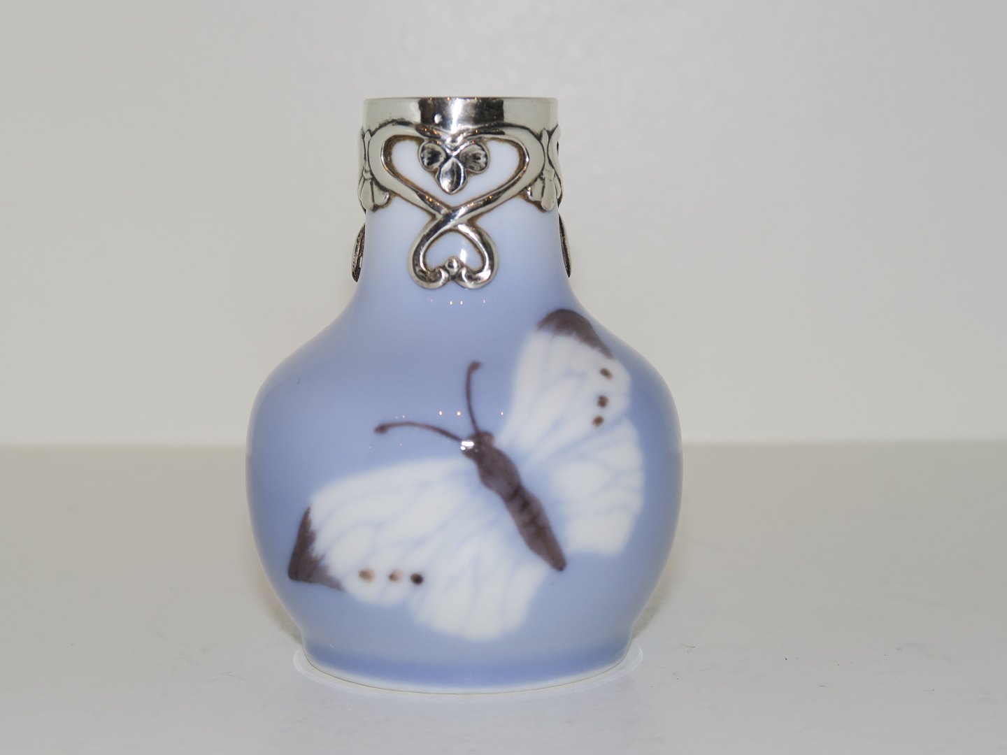 Royal Copenhagen small Art Nouveau vase decorated with butterflies and with silver mounting.