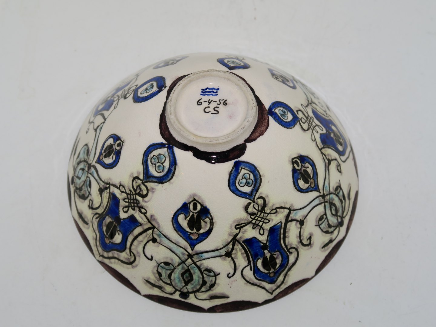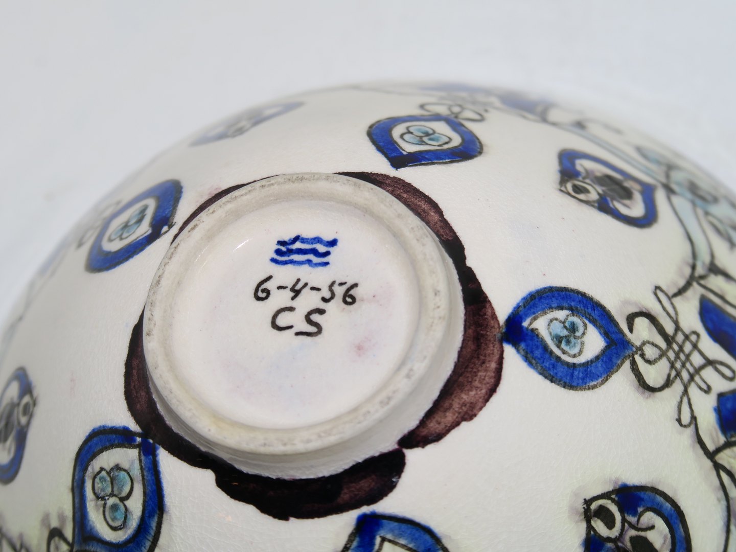 Royal Copenhagen keramik, unika skål dekoreret med ansigter og dateret 6. april 1956 og signeret CS. 1. sortering. Diameter 13,8 cm. Perfekt stand uden fejl.
