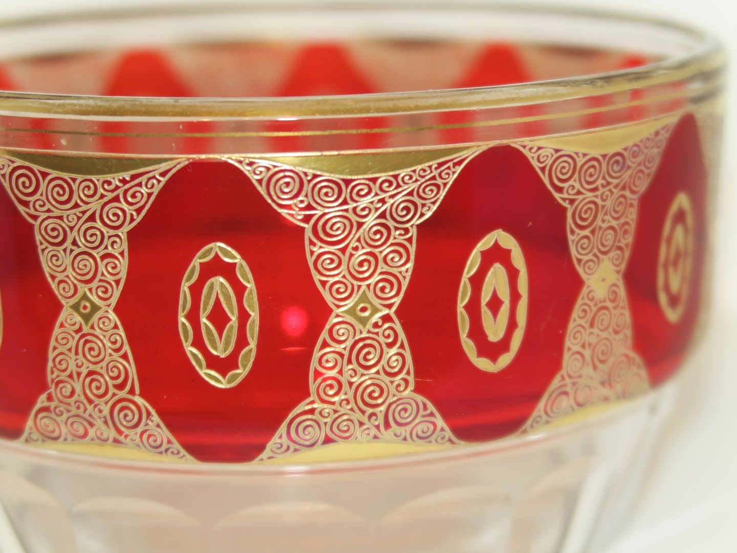 Glasskål i høj kvalitet med rubinrødt glas og håndlagt gulddekoration. Den er fra ca. 1910 til 1930. Diameter 14,0 cm., højde 8,5 cm. Perfekt stand.