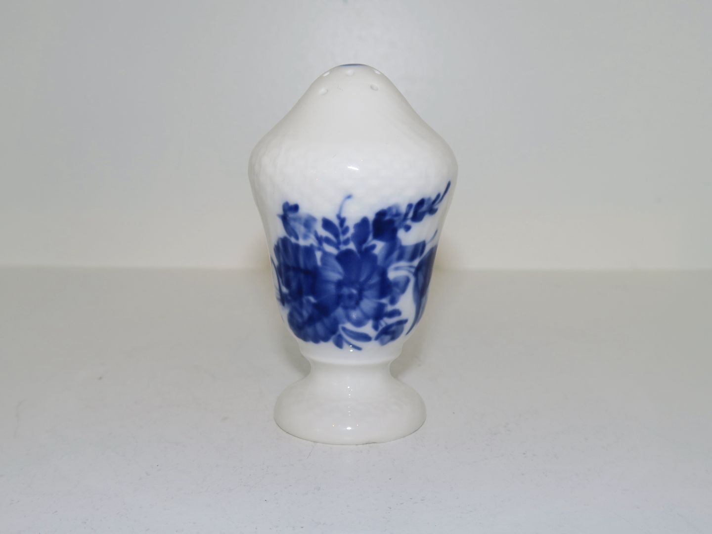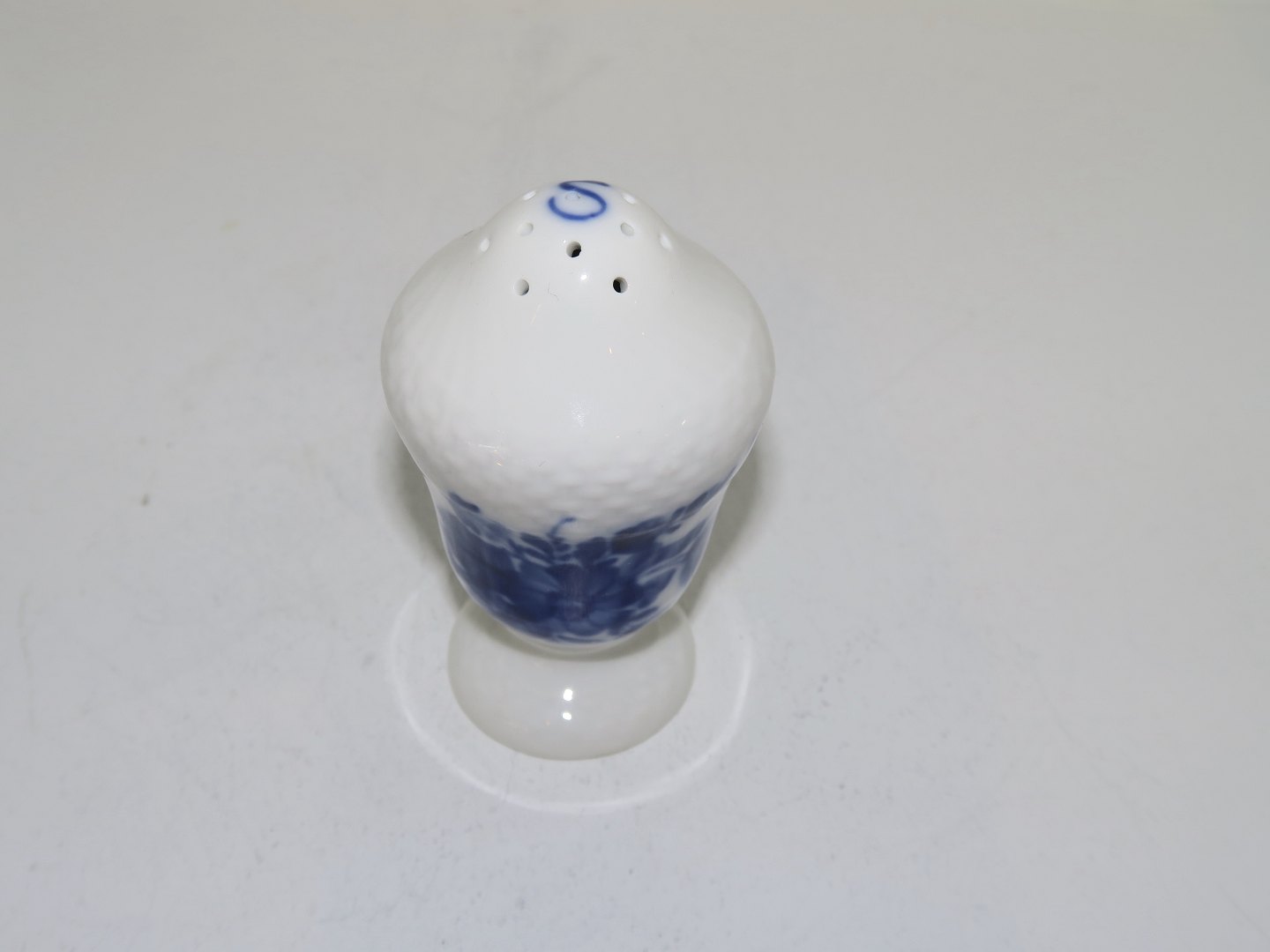 Royal Copenhagen Blå Blomst Svejfet, saltbøsse med "S" i toppen. Dekorationsnummer 10/1876. 1. sortering. Højde 8,5 cm. Perfekt stand uden fejl.