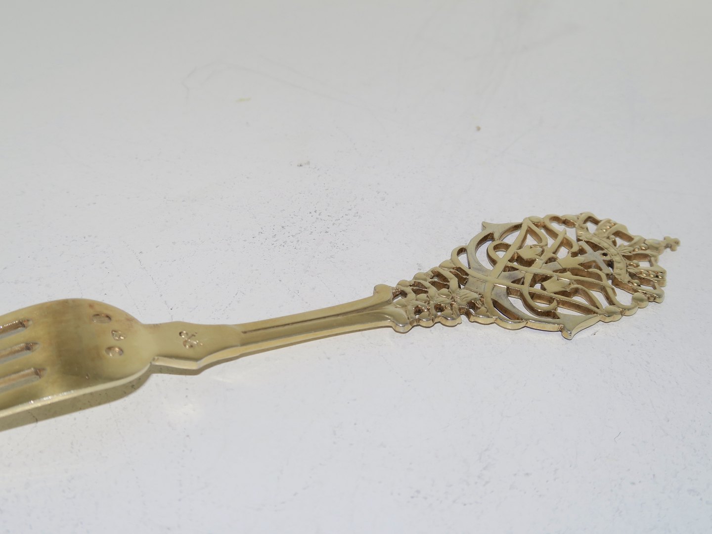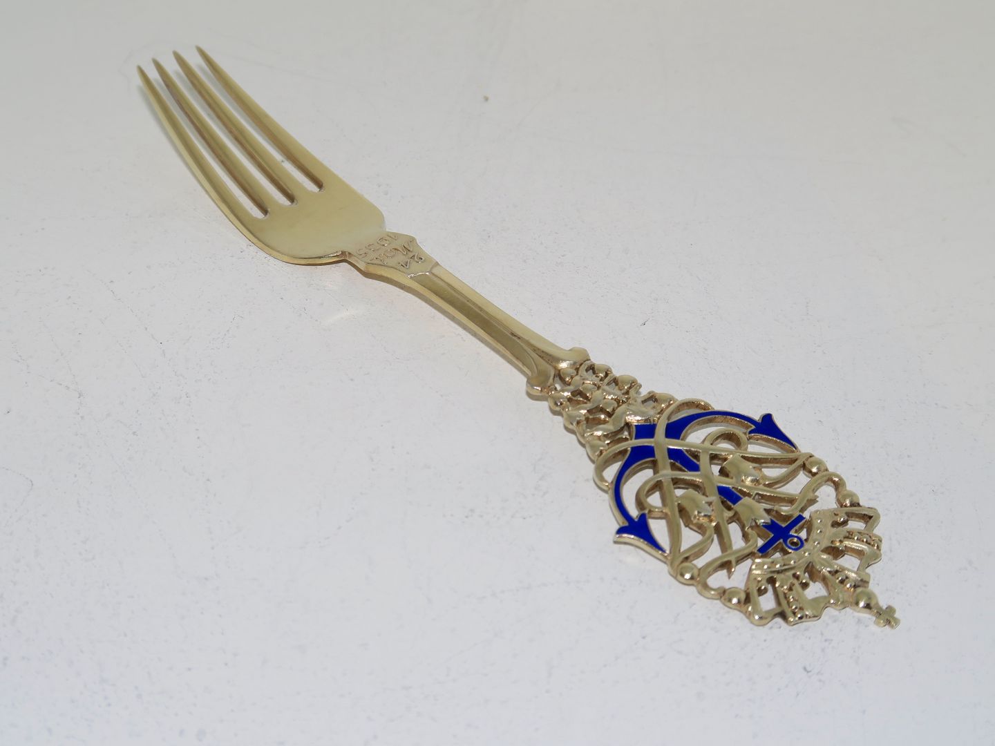 Anton Michelsen guilded sterling silver, commemorative fork from 1935. The wedding of Crown Prince Frederik and Princess Ingrid on May 24th. 1935. Designed by Jens Ingwersen. Length 16.5 cm. Perfect condition.