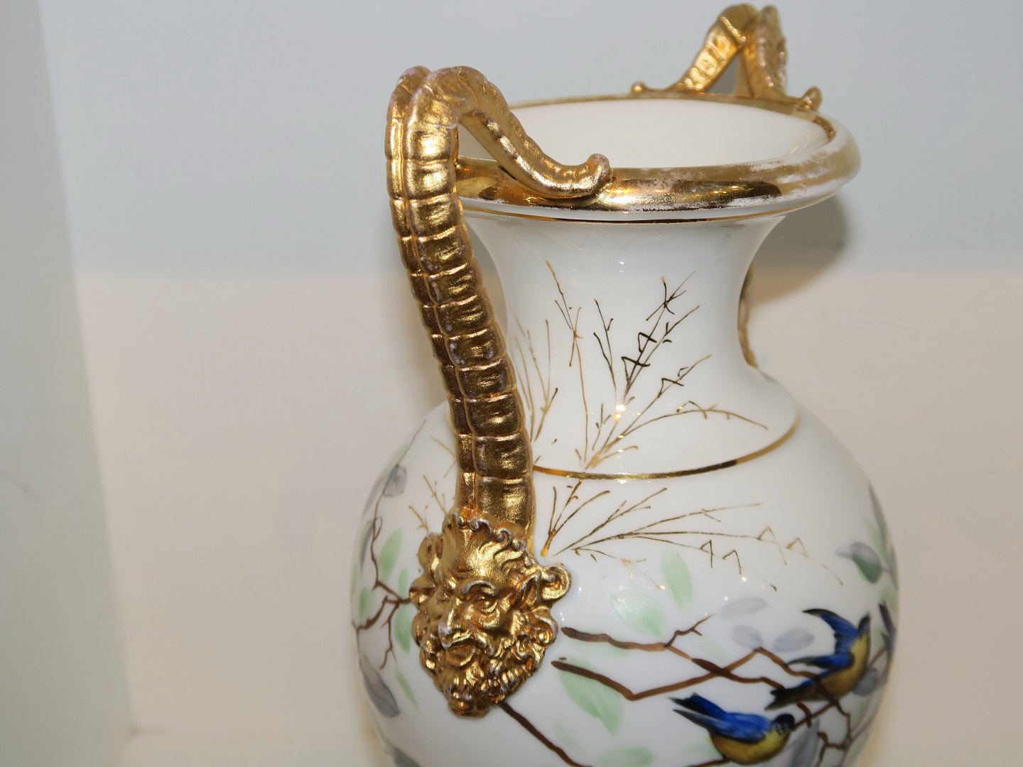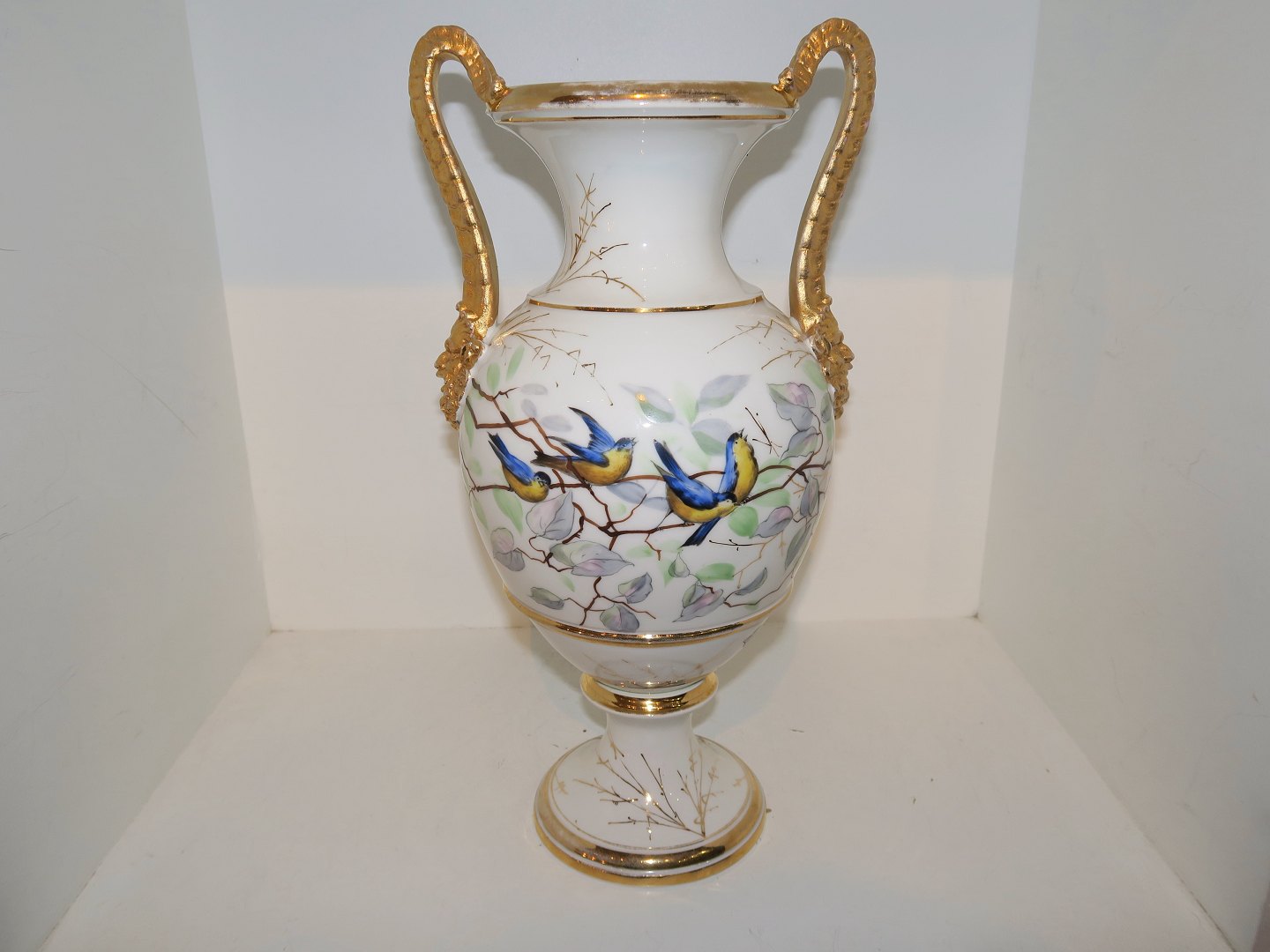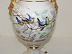 Bing & Grøndahl høj pragtvase med guldhåndtag og dekoreret med fugle på begge sider.