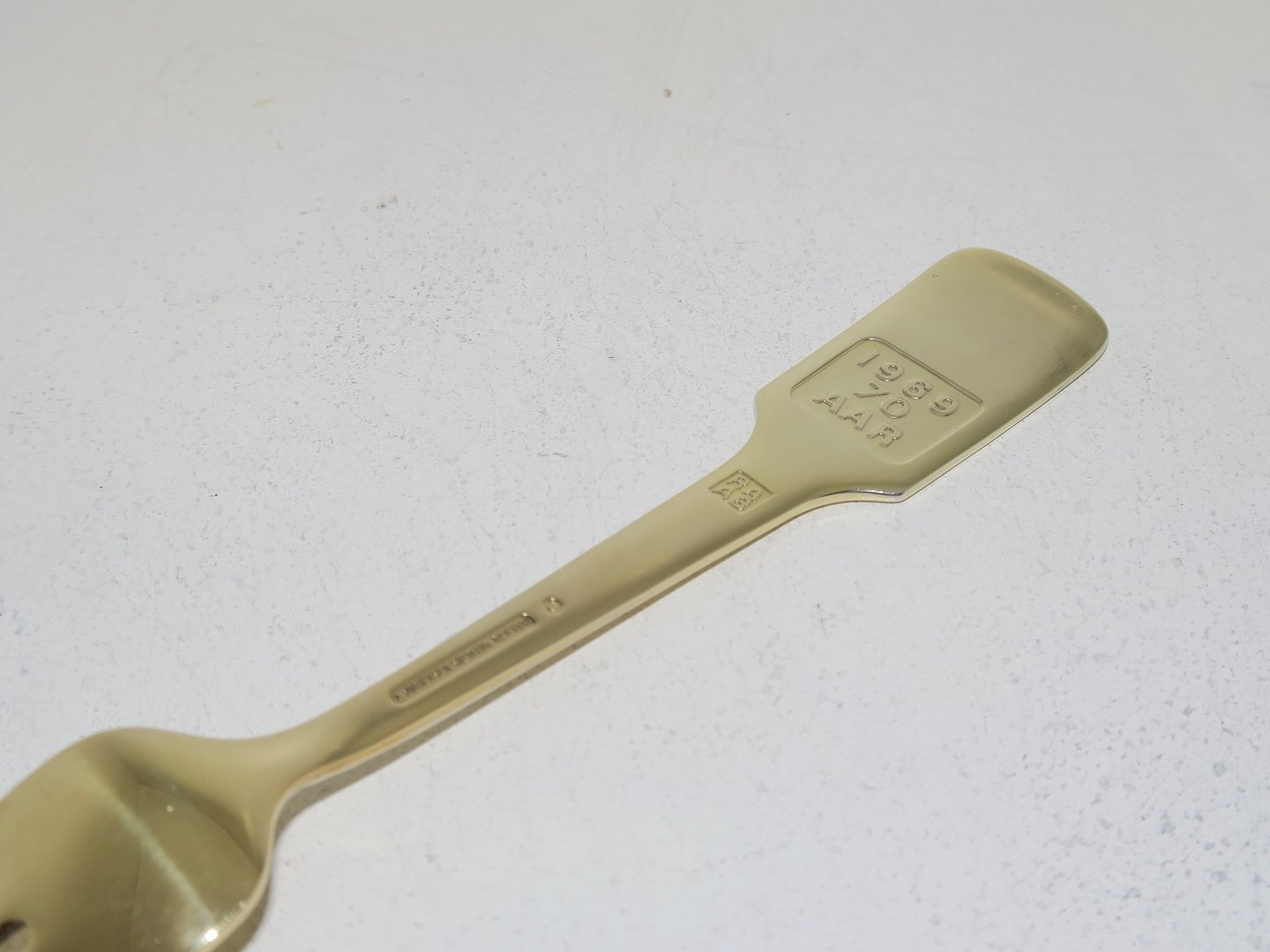 Michelsen forgyldt sterlingsølv, mindegaffel fra 1969. Mindegaffel i anledning af Kong Frederik IX's 70 års fødselsdag. Designet af Rigmor Andersen & Annalise Bjørner. Længde 16,3 cm. Fin og velholdt stand.