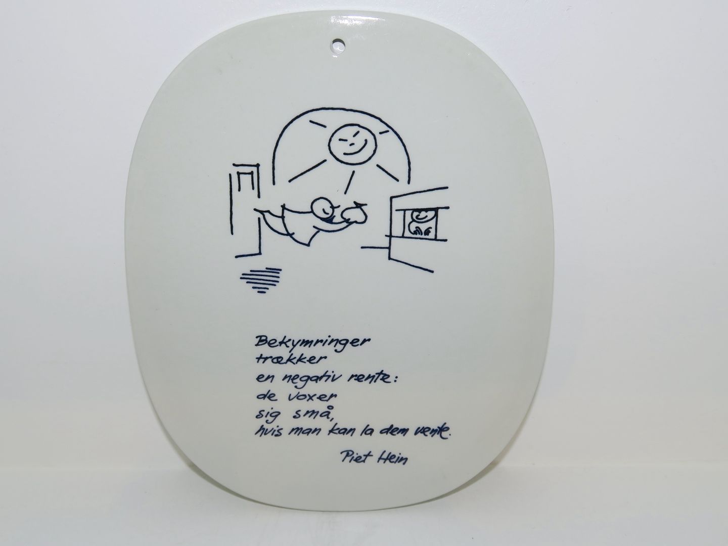 Royal Copenhagen Piet Hein platte med gruk. Bekymringer trækker negativ rente: de voxer sig små, hvis man kan la dem vente. Dekorationsnummer 5-3713. 1. sortering. Måler 16,7 x 14,0 cm. Perfekt stand uden fejl.