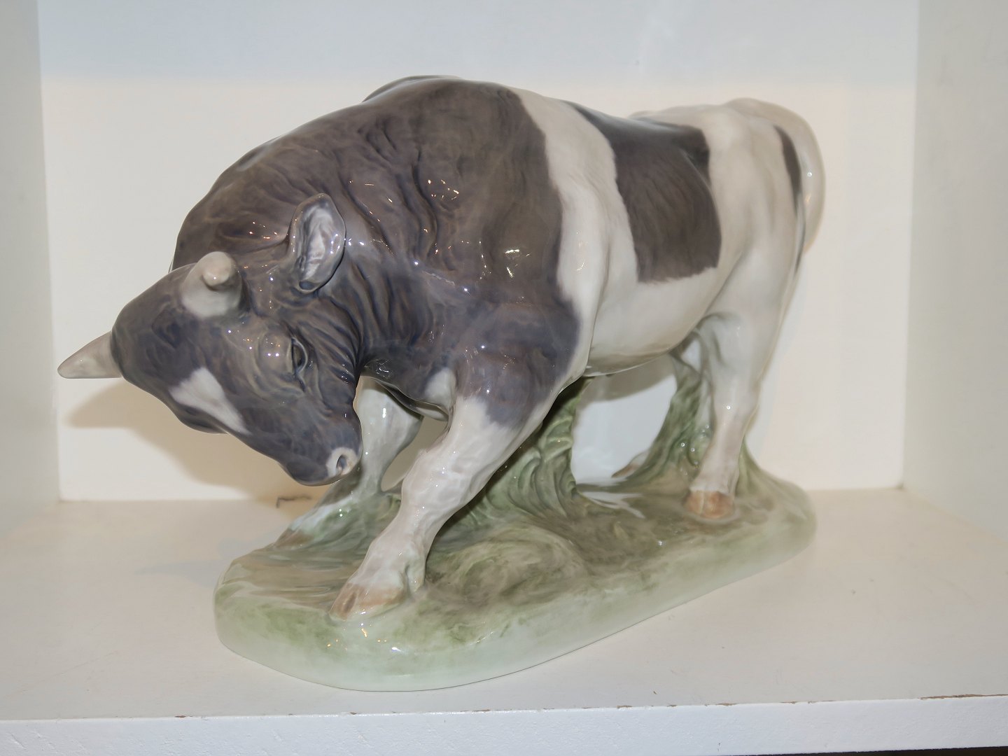 Stor Royal Copenhagen figur, tyr på base. Designet af Knud Kyhn. Dekorationsnummer 1195. Medarbejdersortering. Længde 36,0 cm. Perfekt stand uden fejl.