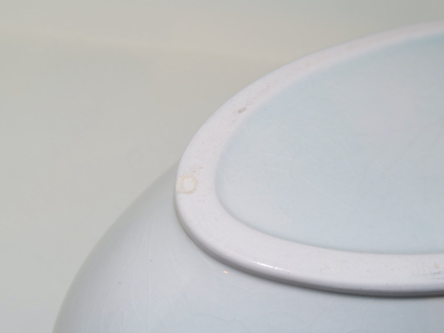 There is a repair at the top edge, see picture please and a small chip at stand point edge, see picture please. There are slight crazings in glaze otherwise perfect condition.