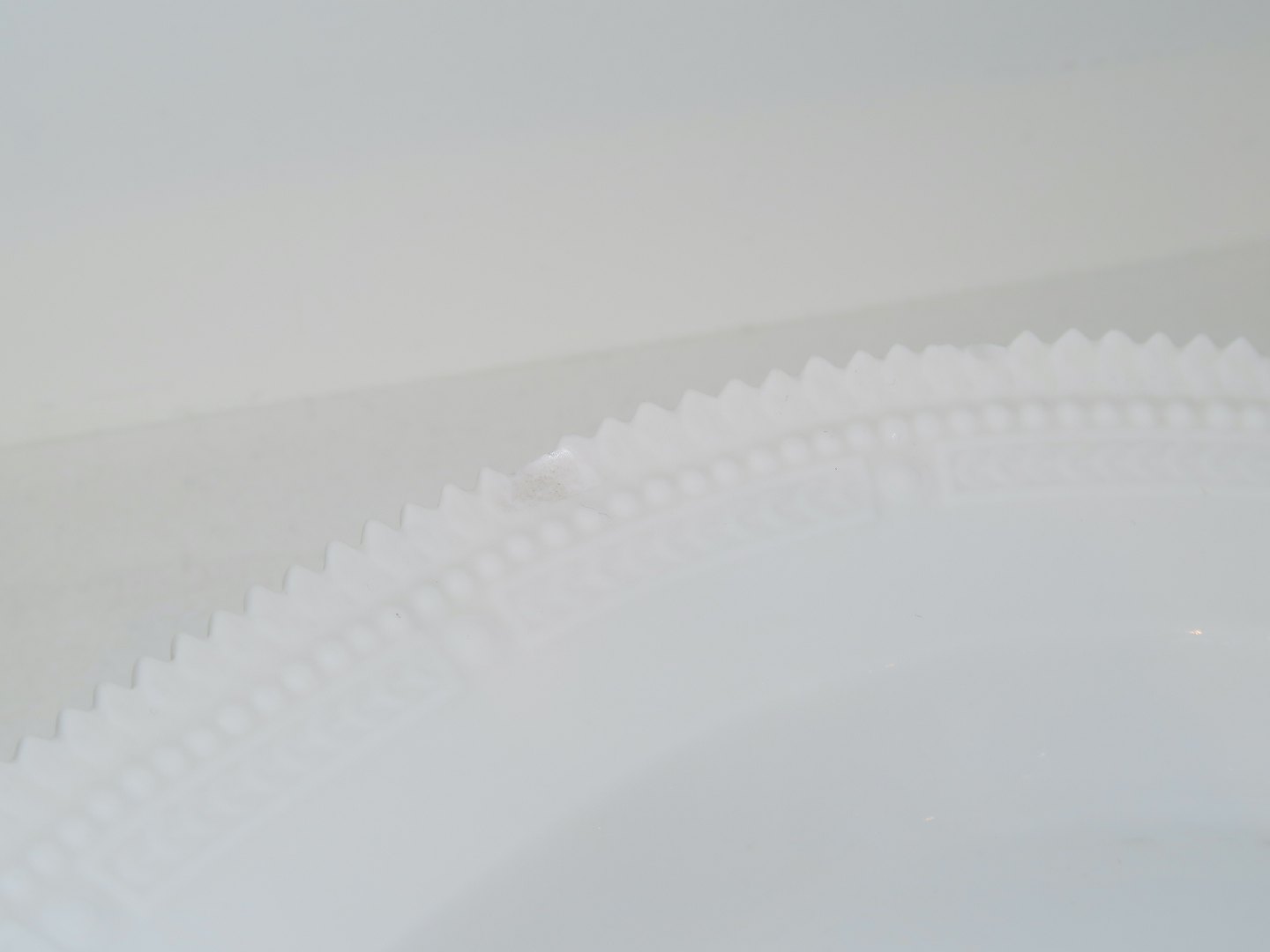 There is a chip on edge and several chips on the leaves and branches by handle. Otherwise excellent condition.