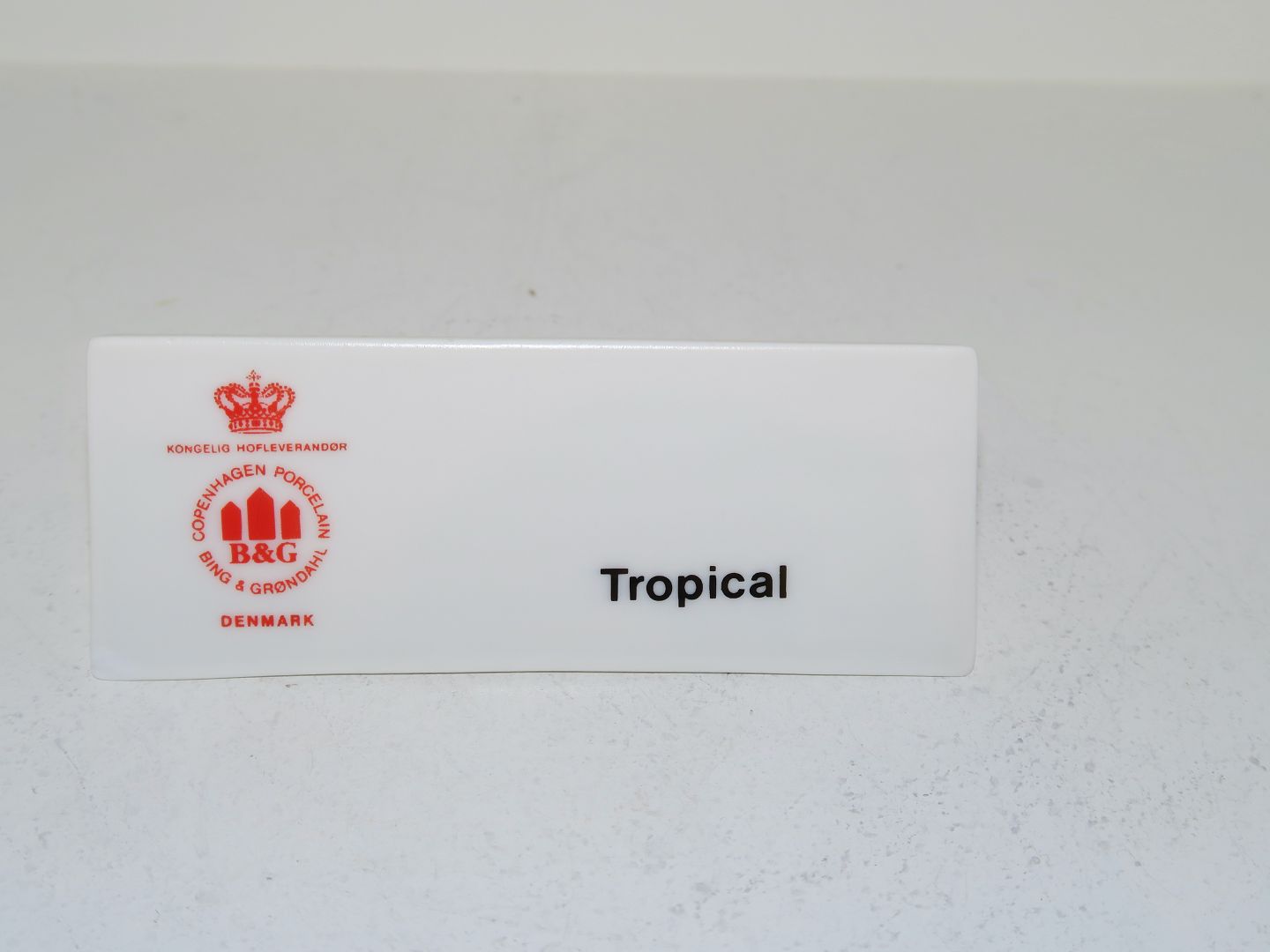 Bing & Grondahl Tropical dealer sign. Length 10.0 cm., height 4.0 cm. There is a small chip on the back, see picture please, otherwise perfect condition.