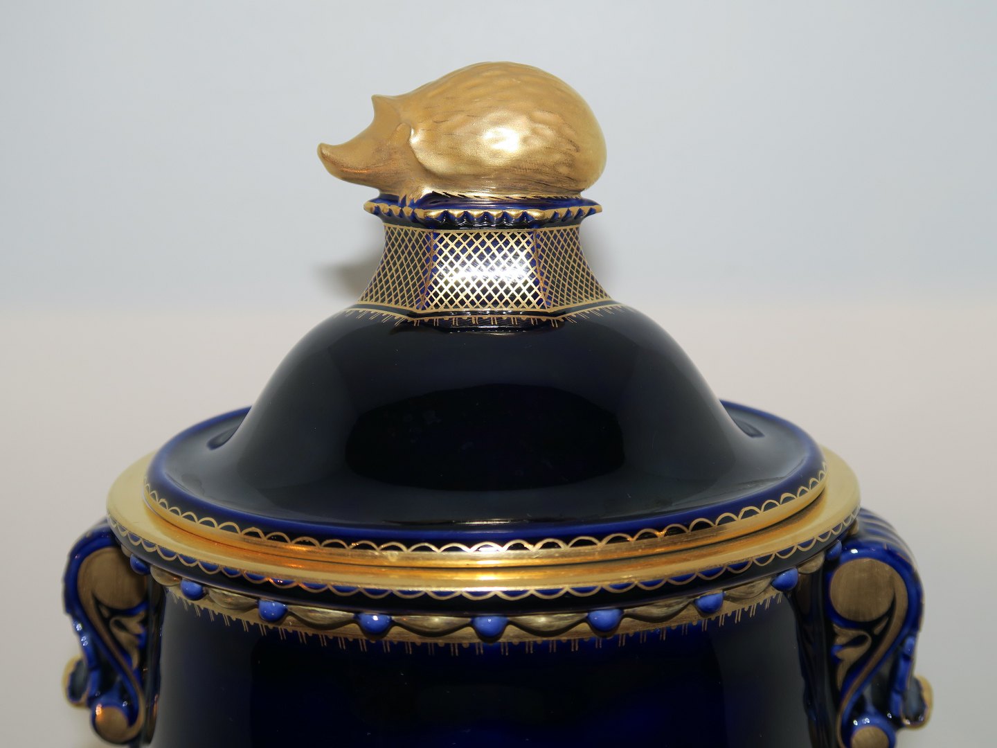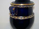 Bing & Grøndahl stor mørkeblå krukke med guldkant med et pindsvin på låget.