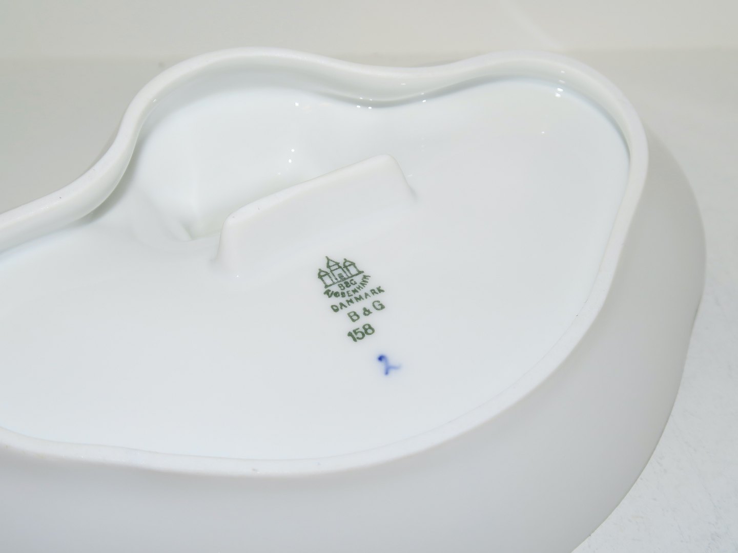 Bing & Grøndahl Empire, tændstikæskeholder. Af fabriksmærket kan det udledes, at denne er fra mellem år 1948 og 1952. Dekorationsnummer 158. 2. sortering. Længde 18,3 cm. Perfekt stand uden fejl.