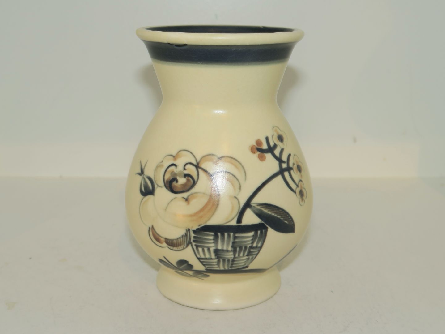 Aluminia Mat Porcelæn, vase dekoreret med blomst i vase.