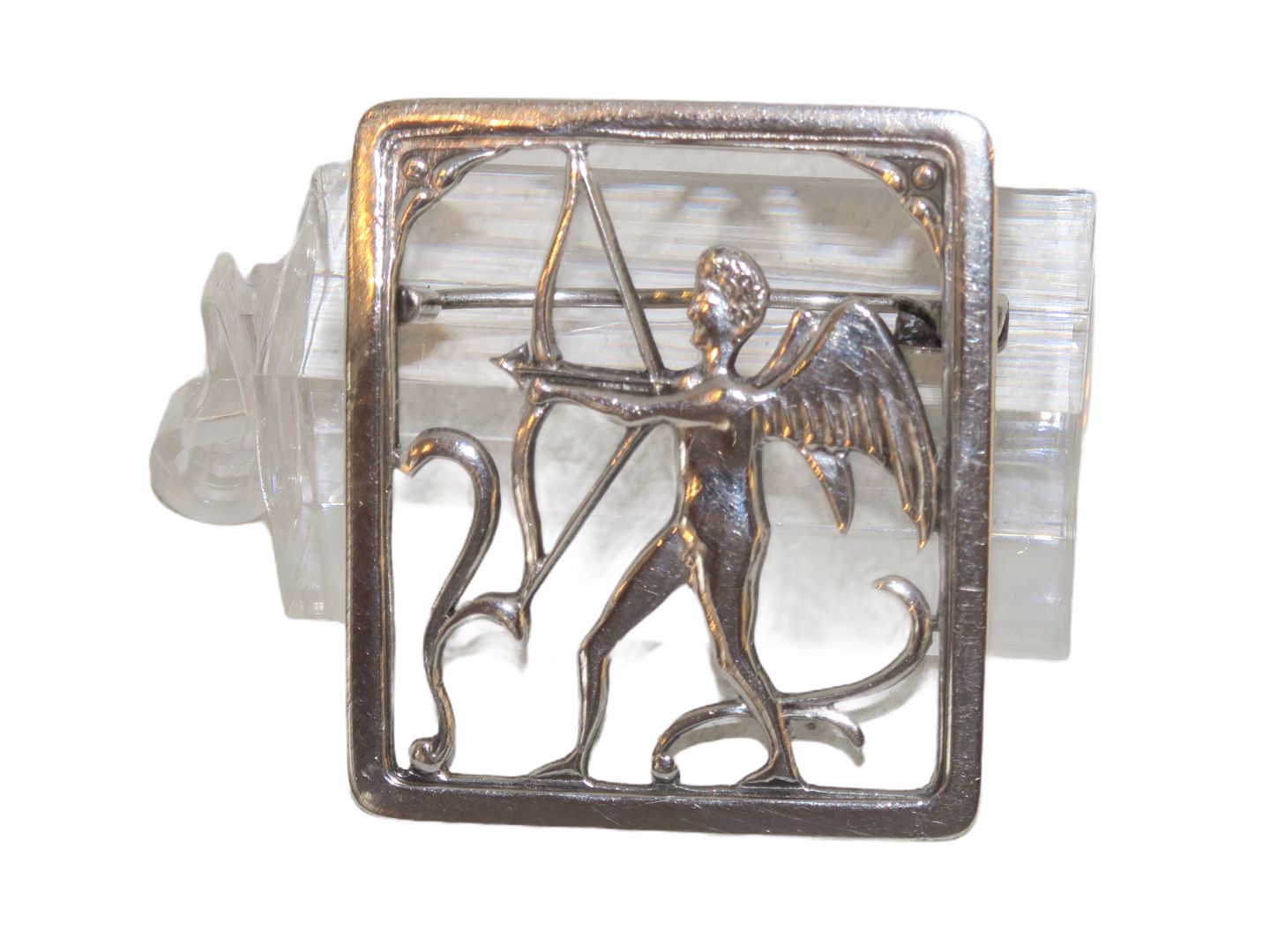 S.H. Mathiesen sølv, firkantet broche, Amor med pil. S.H. Mathiesen var sølvsmed i Aalborg fra 1896 til 1937. Denne er fra 1930'erne Stemplet "S.M 830S". Måler 3,8 x 3,5 cm. Perfekt stand.