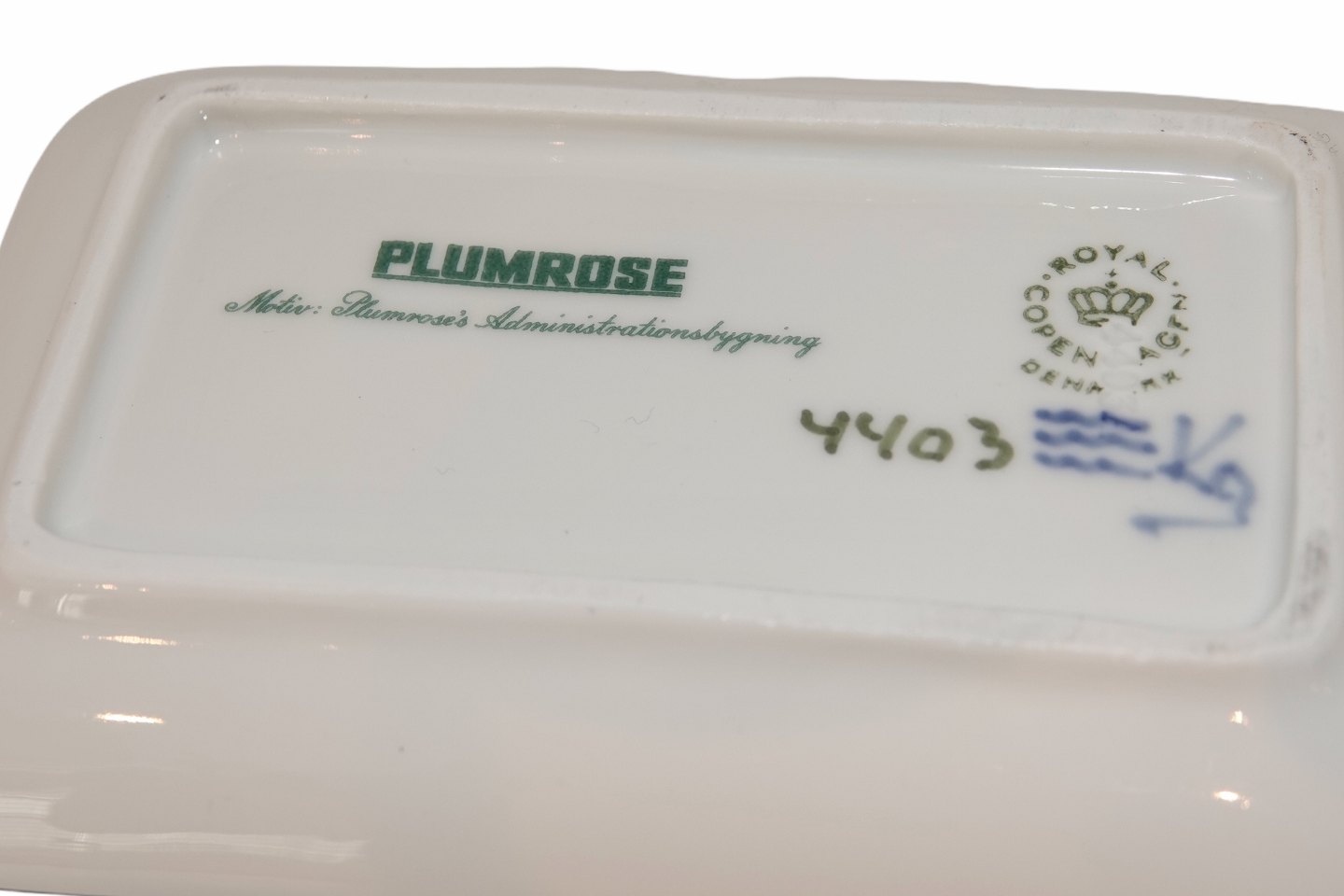 Royal Copenhagen small dish decorated with Danish Plumrose Building.