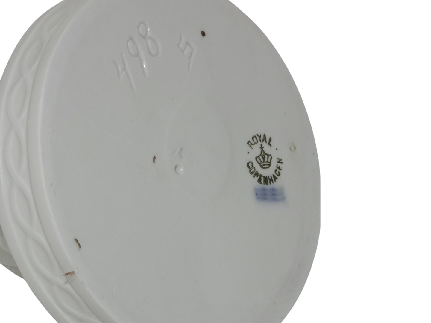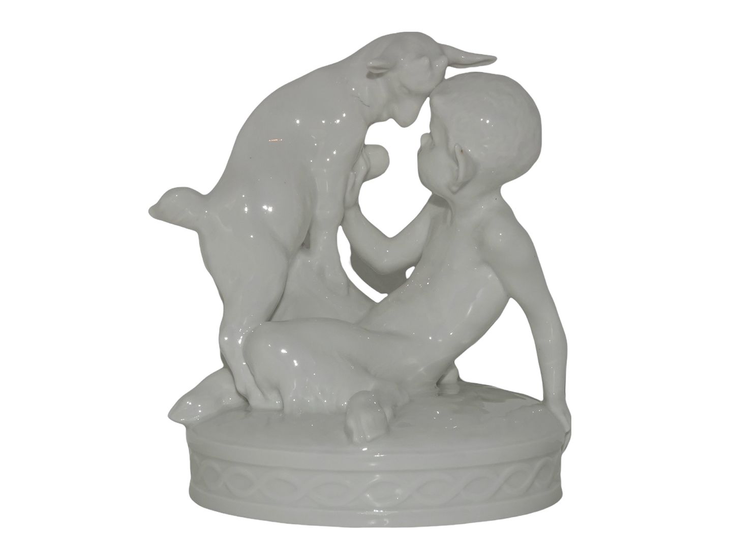 Royal Copenhagen figur, hvid pan (faun) med gedekid. Af fabriksmærket ses det, at denne er produceret i mellem 1898 og 1923. Dekorationsnummer 498. 1. sortering. Højde 13 cm. Perfekt stand uden fejl.