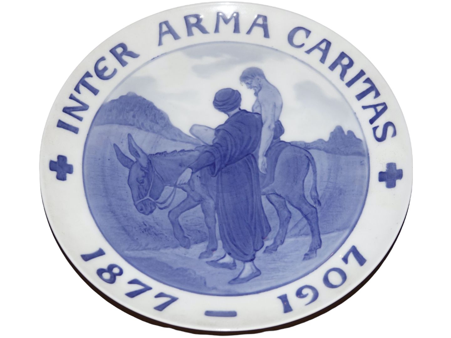 Royal Copenhagen Mindeplatte fra 1907, Røde Kors 30 års jubilæum. Den Barmhjertige Samaritan - Inter Arma Caritas (Næstekærlighed i Krig).