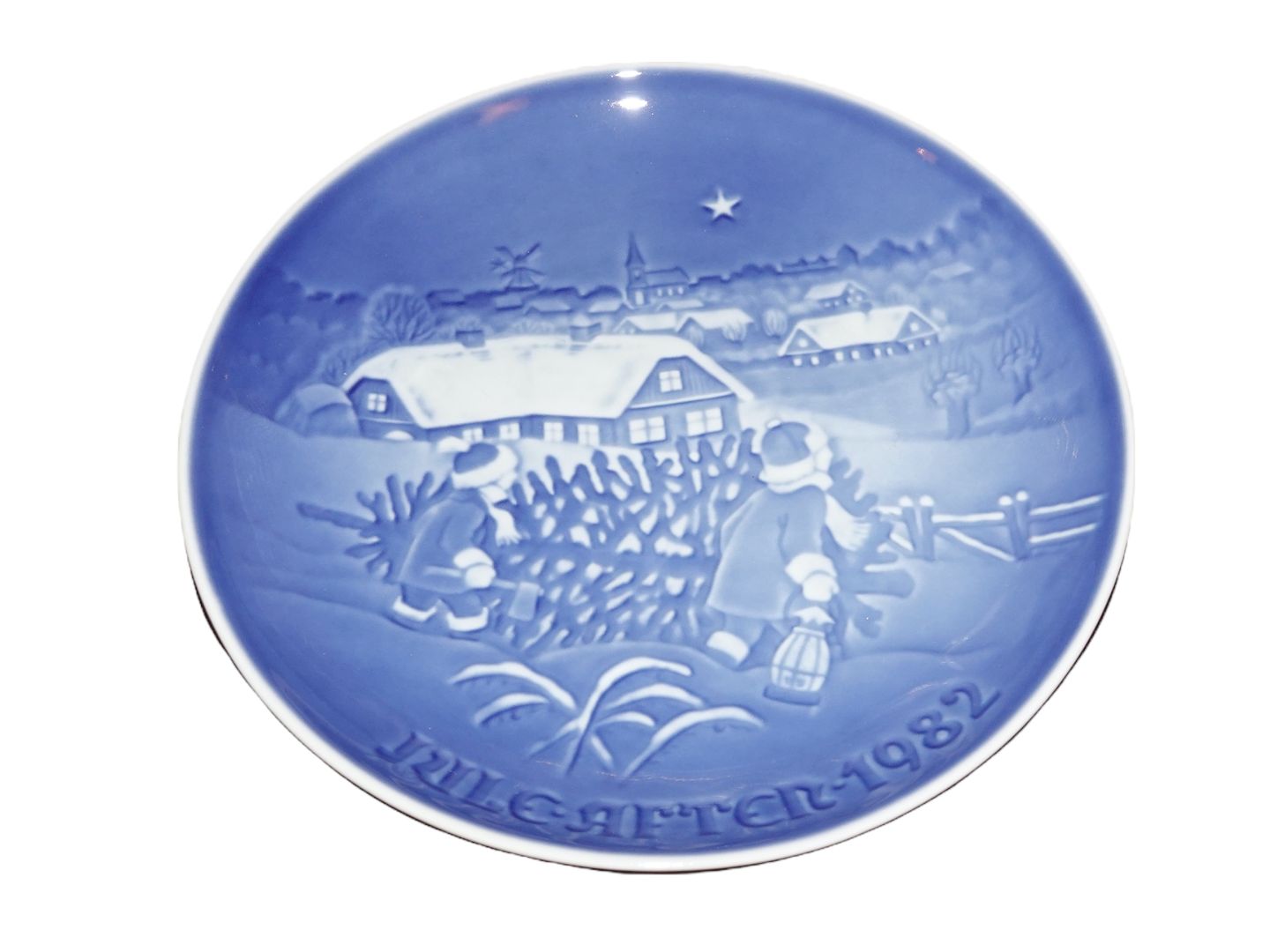 Bing & Grøndahl juleplatte fra 1982 - Juletræet Hentes. 1. sortering. Diameter 18 cm. Perfekt stand uden fejl.