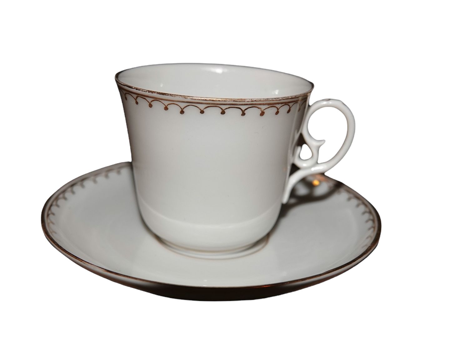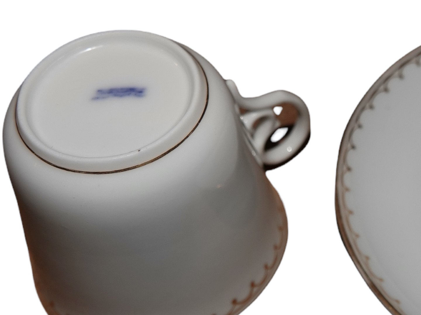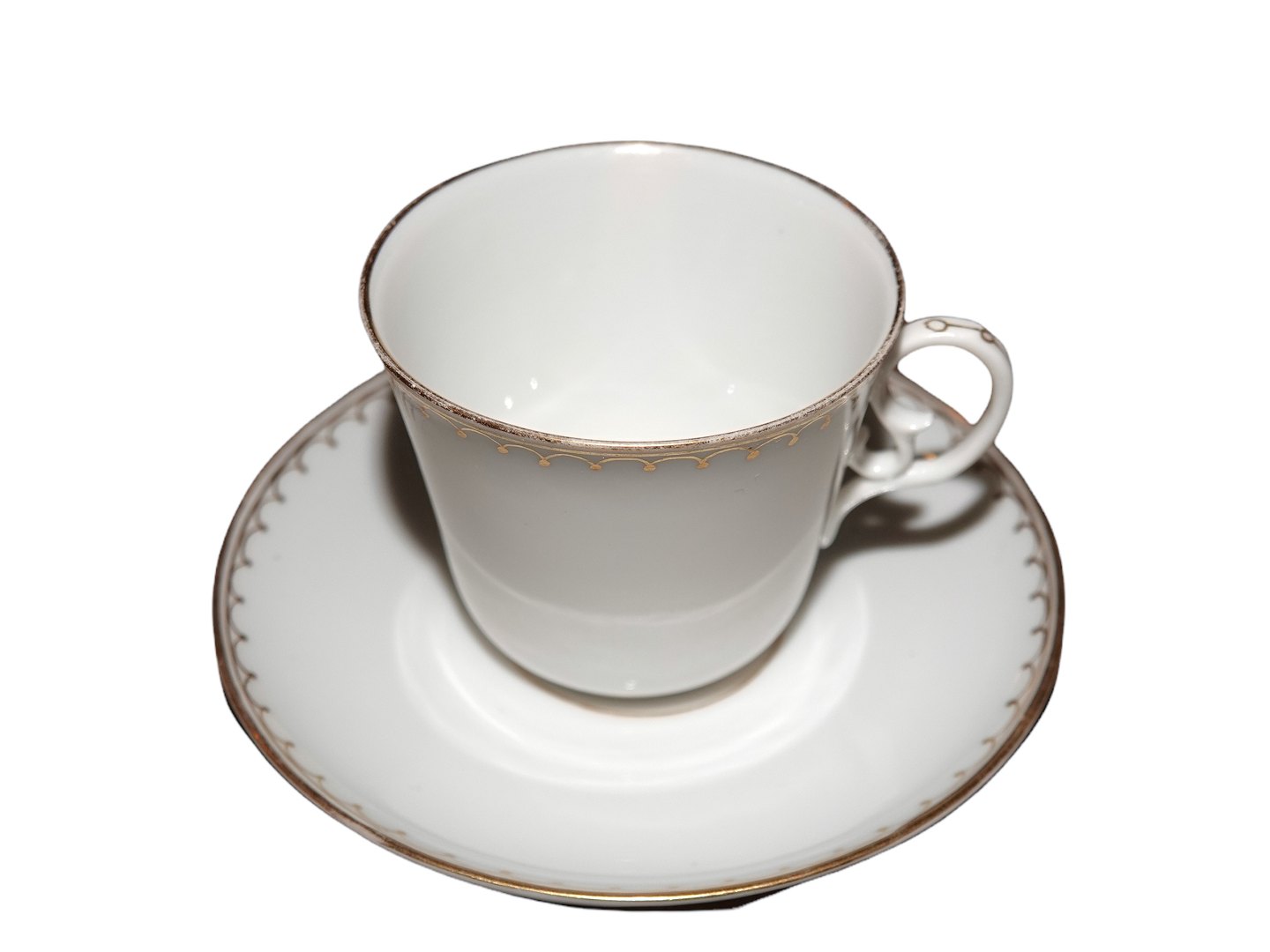 Royal Copenhagen early white withgold edge, small demitasse coffeecup with matching saucer. It is made in thin porcelain.