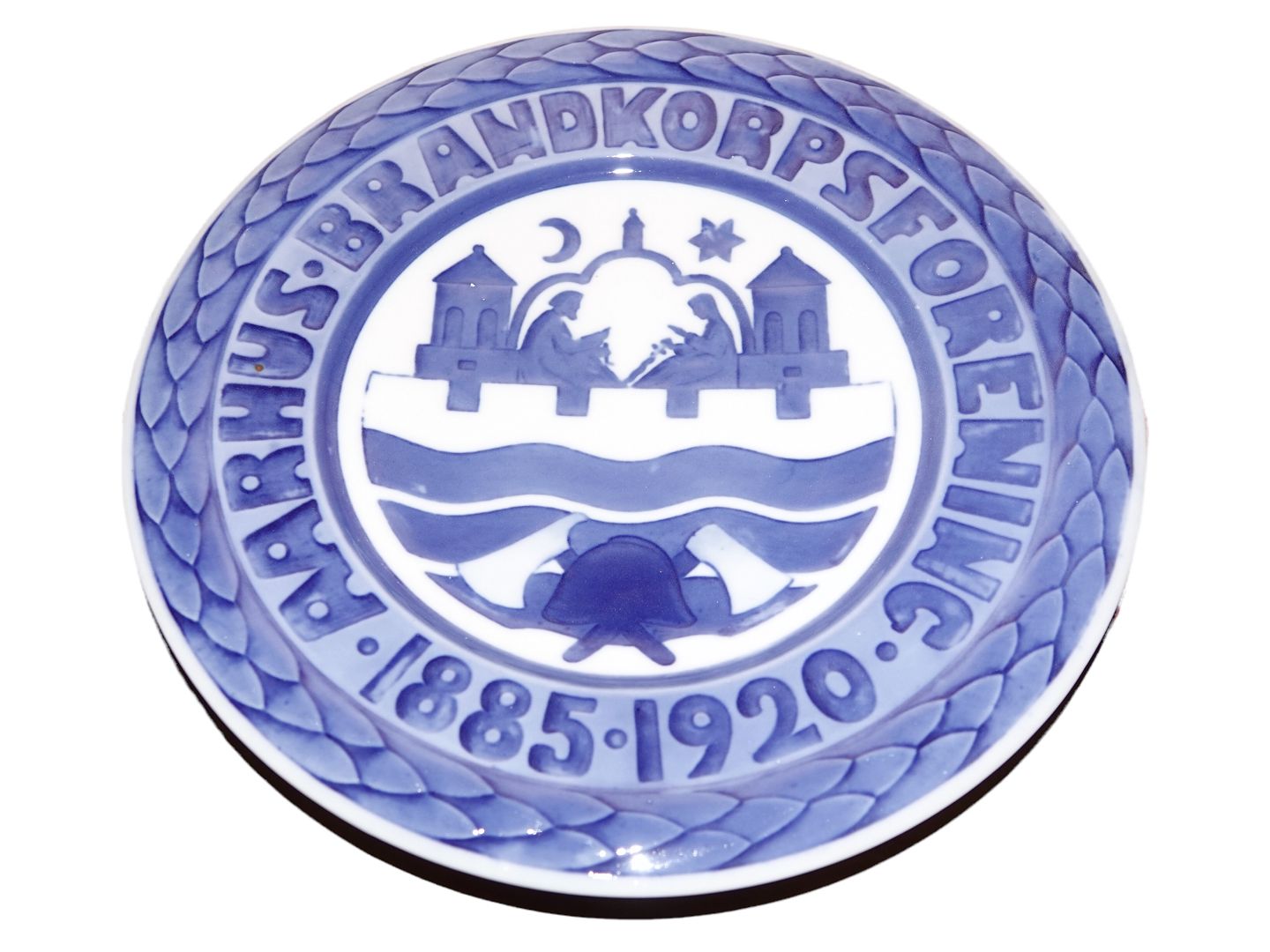 Royal Copenhagen Mindeplatte fra 1920, Aarhus Brandkorpsforening 1885-1920. 1. sortering. Diameter 23,0 cm. Perfekt stand uden fejl.