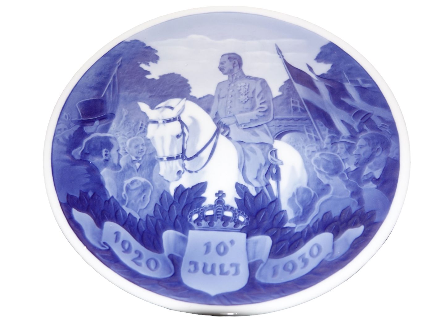 Royal Copenhagen Commemorative plate from 1930, 10th anniversary of the reunion of Northern Slesvig with Denmark. July 10th. 1920-1930. King Christian X on horse. Factory first. Diameter 24.3 cm. Perfect condition.
