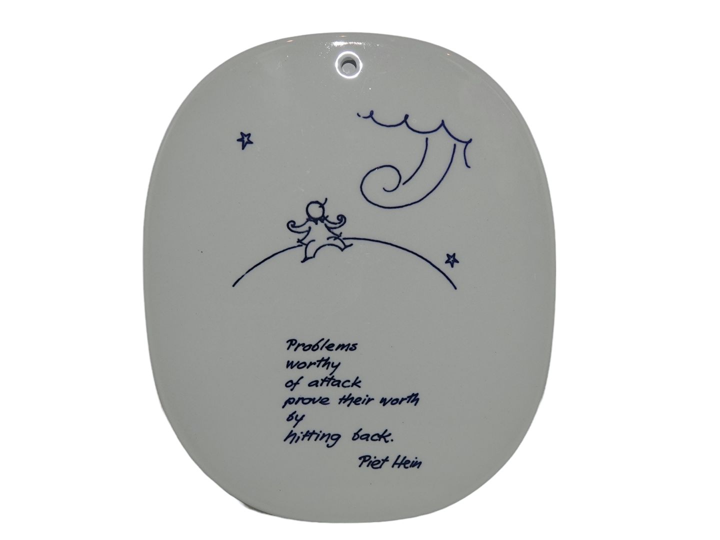 Royal Copenhagen Piet Hein platte med gruk på engelsk. Problems worthy of attack prove their worth by hitting back. Dekorationsnummer 14-3713. 1. sortering. Måler 16,7 x 14,0 cm. Perfekt stand uden fejl.