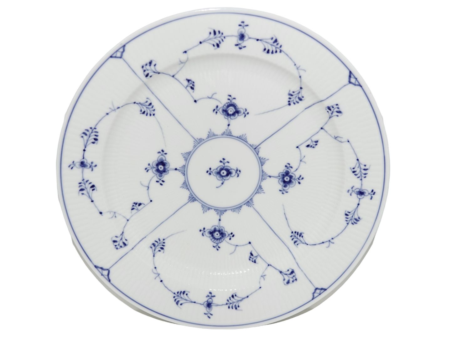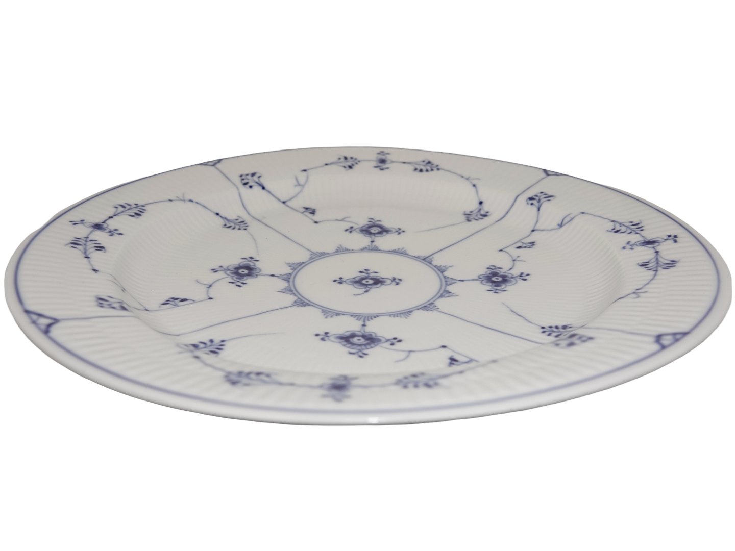 Royal Copenhagen Musselmalet Riflet, stort rundt fad. Af fabriksmærket kan det udledes, at denne er produceret i mellem 1898 og 1923. Dekorationsnummer 1/107. 2. sortering. Diameter 33,0 cm. Perfekt stand uden fejl.