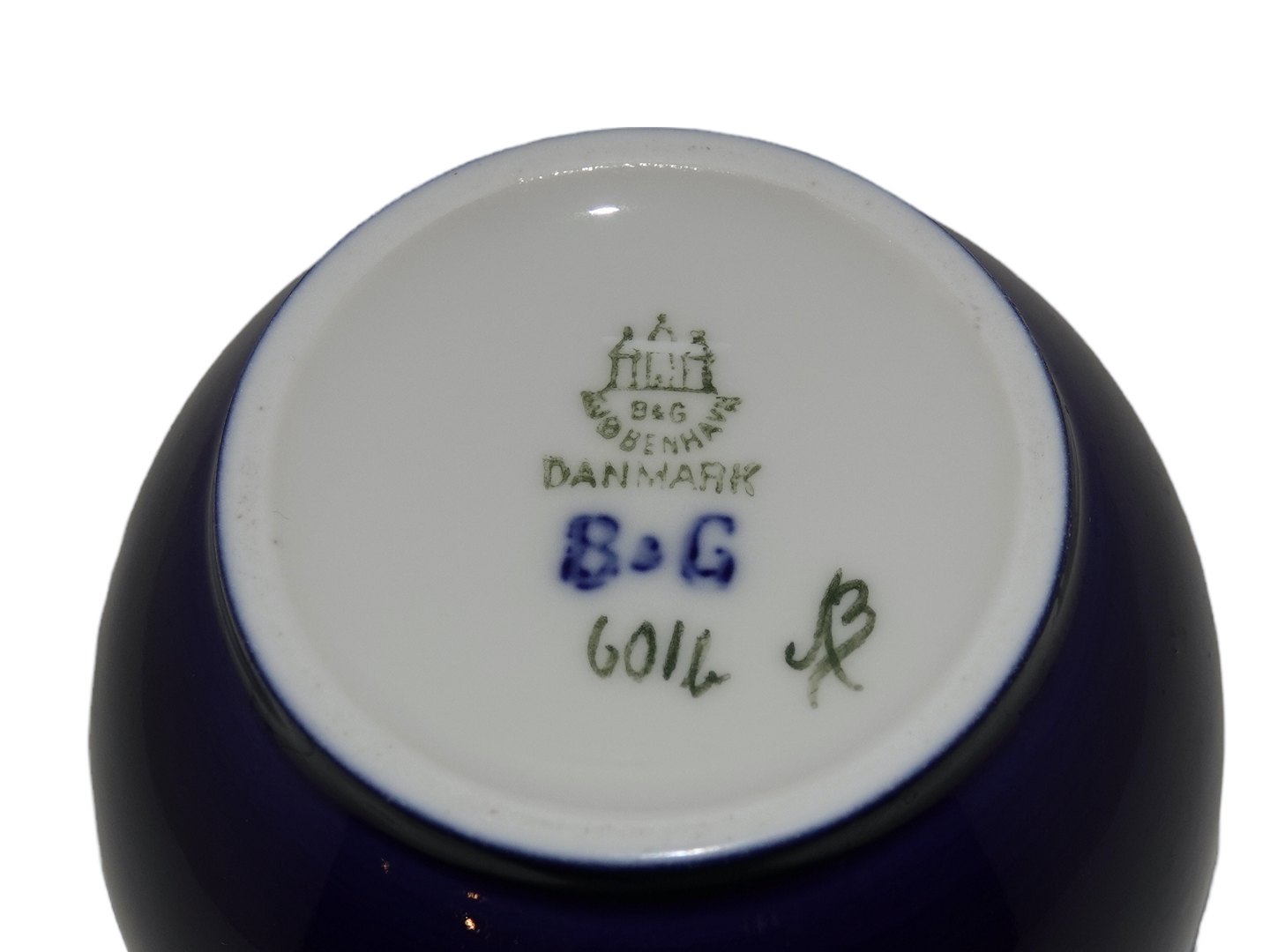 Bing & Grøndahl mørkeblåt bæger. Af fabriksmærket ses det, at denne er produceret i mellem 1915 og 1948. Dekorationsnummer 6016. 2. sortering. Højde 8,4 cm., diameter 8,4 cm. Perfekt stand uden fejl.