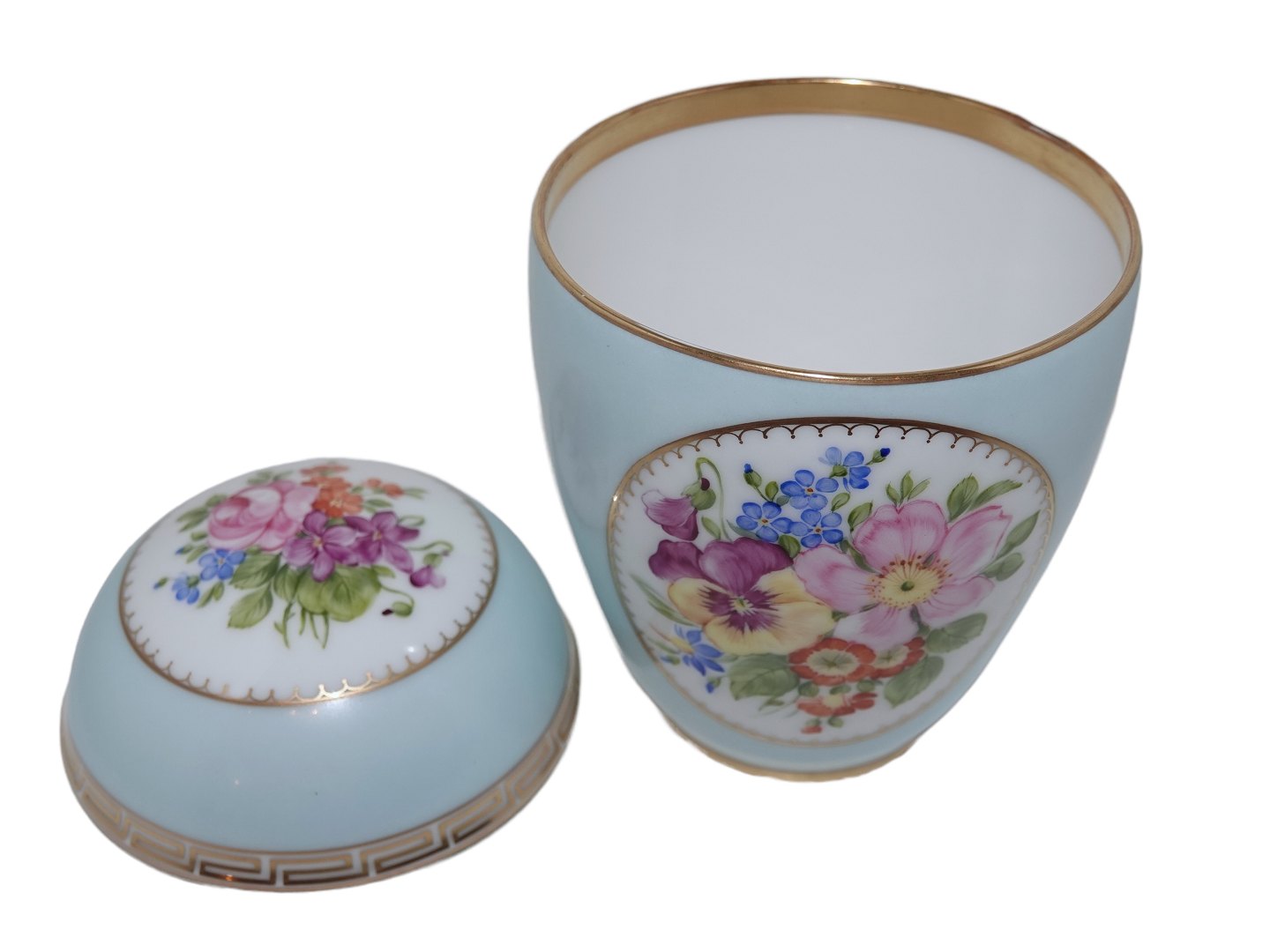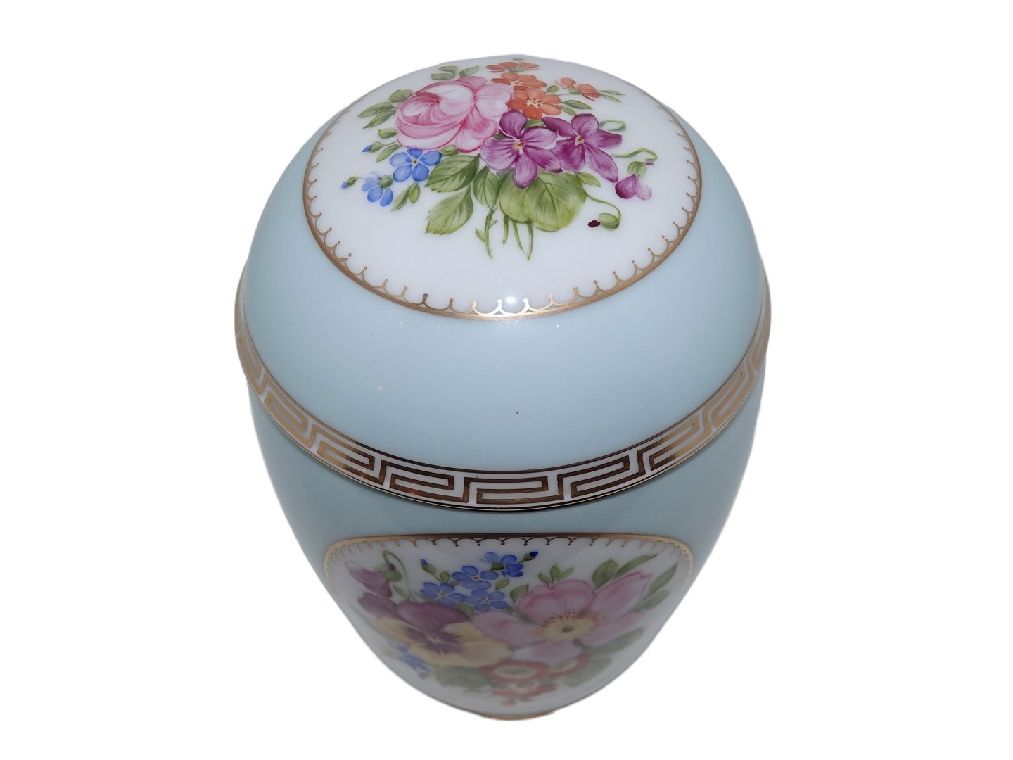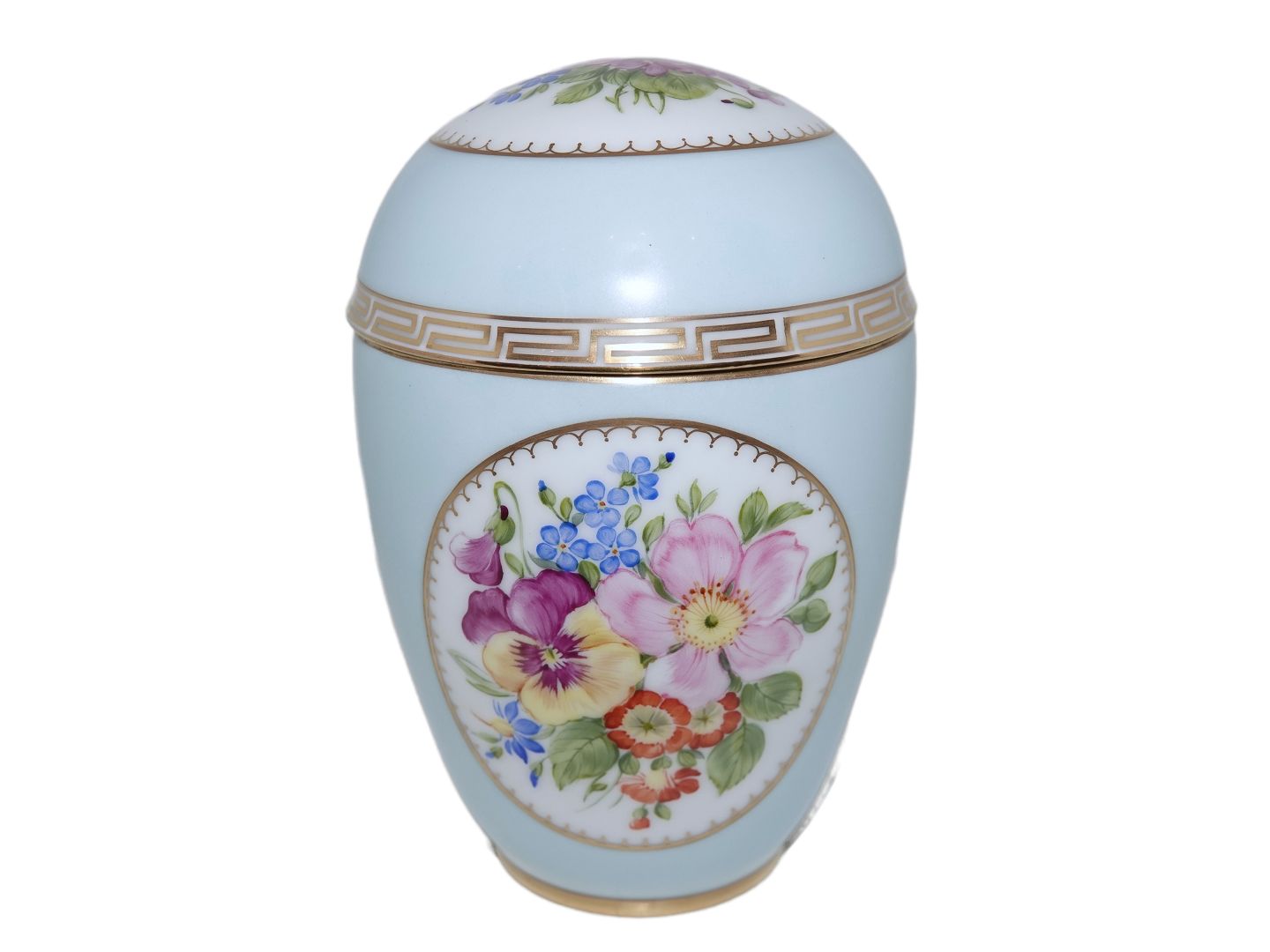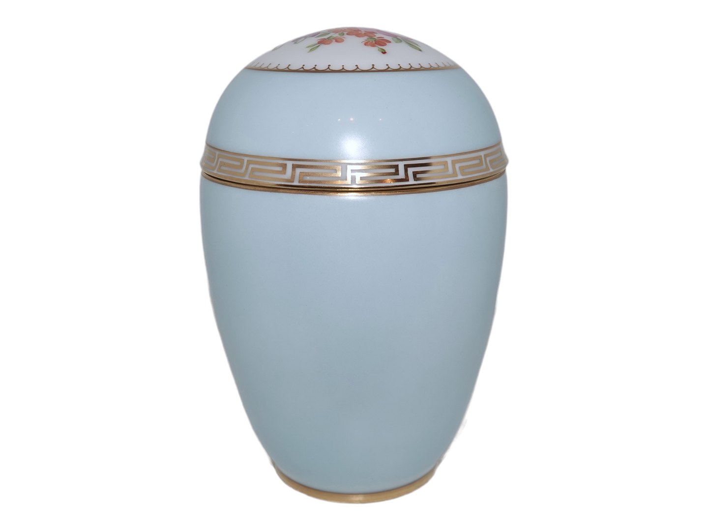 Royal Copenhagen lyseblå lågvase med blomster. Af fabriksmærket ses det, at denne er produceret mellem 1894 og 1897. 1. sortering. Højde 17,0 cm. Perfekt stand uden fejl.