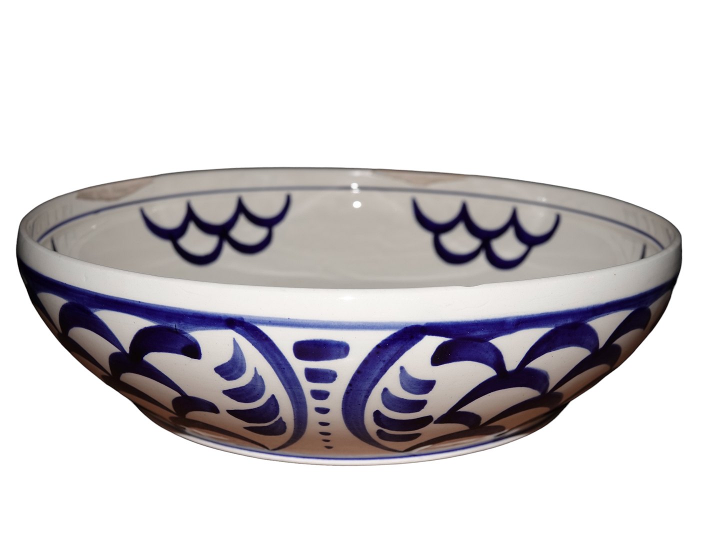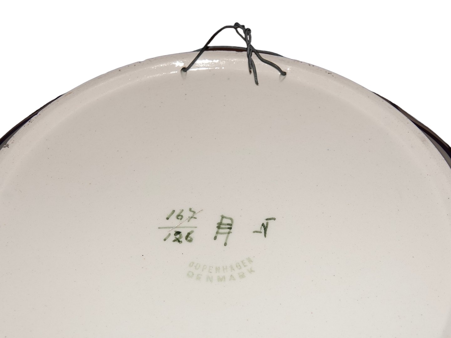 Aluminia stor og tidlig rund skål med vægophæng. Dekoreret med heste.