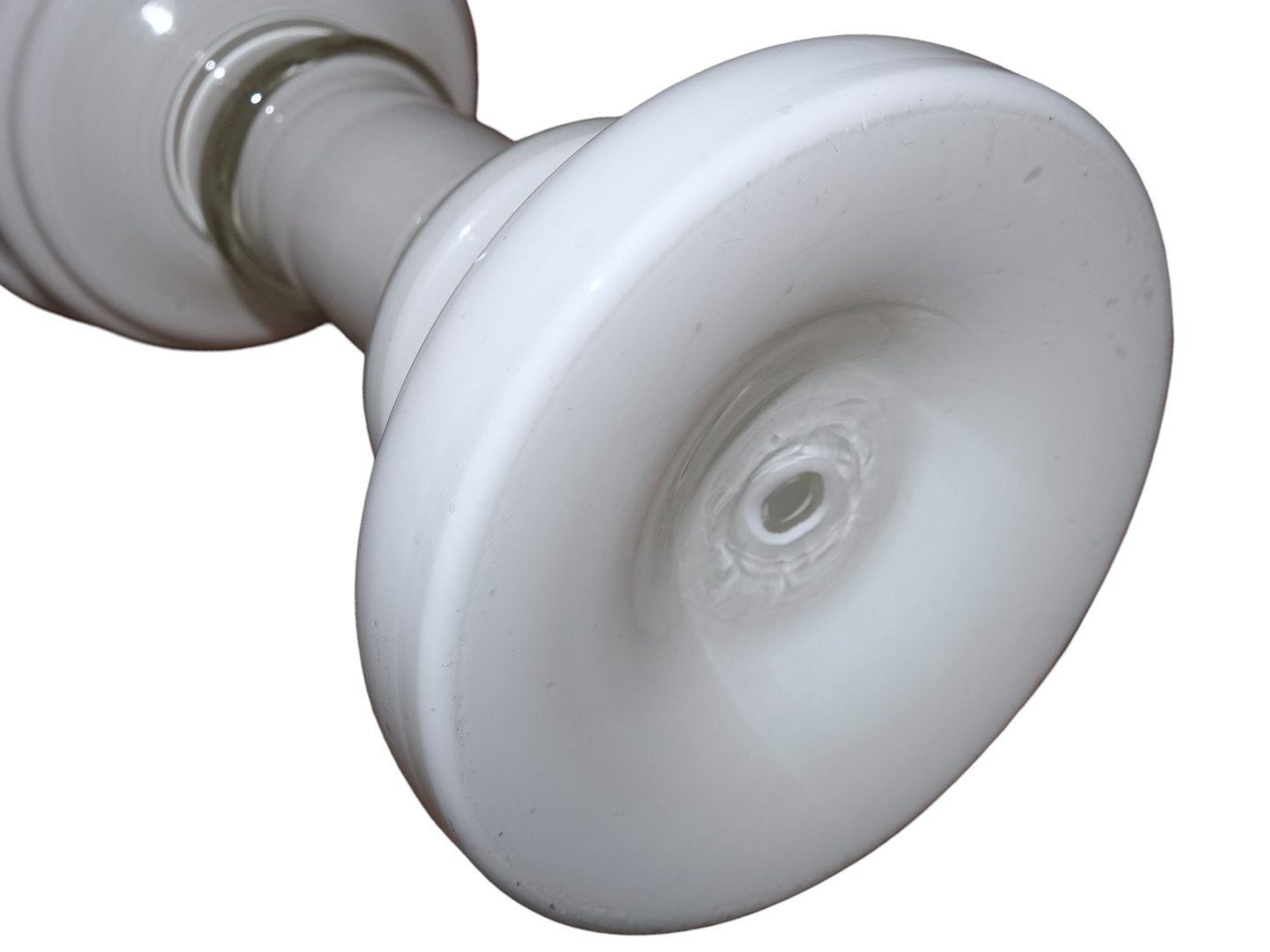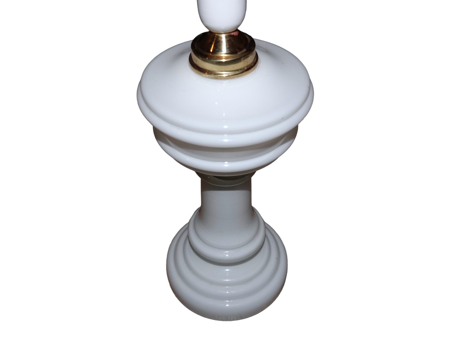 Bordlampe i hvidt opalineglas fra ca. 1850 til 1880. Det er en gammel olielampe, der er konverteret til el. Højde 28,0/48,0 uden/med fatning. Flot og velholdt stand uden fejl. Der er en (1) tilbage.