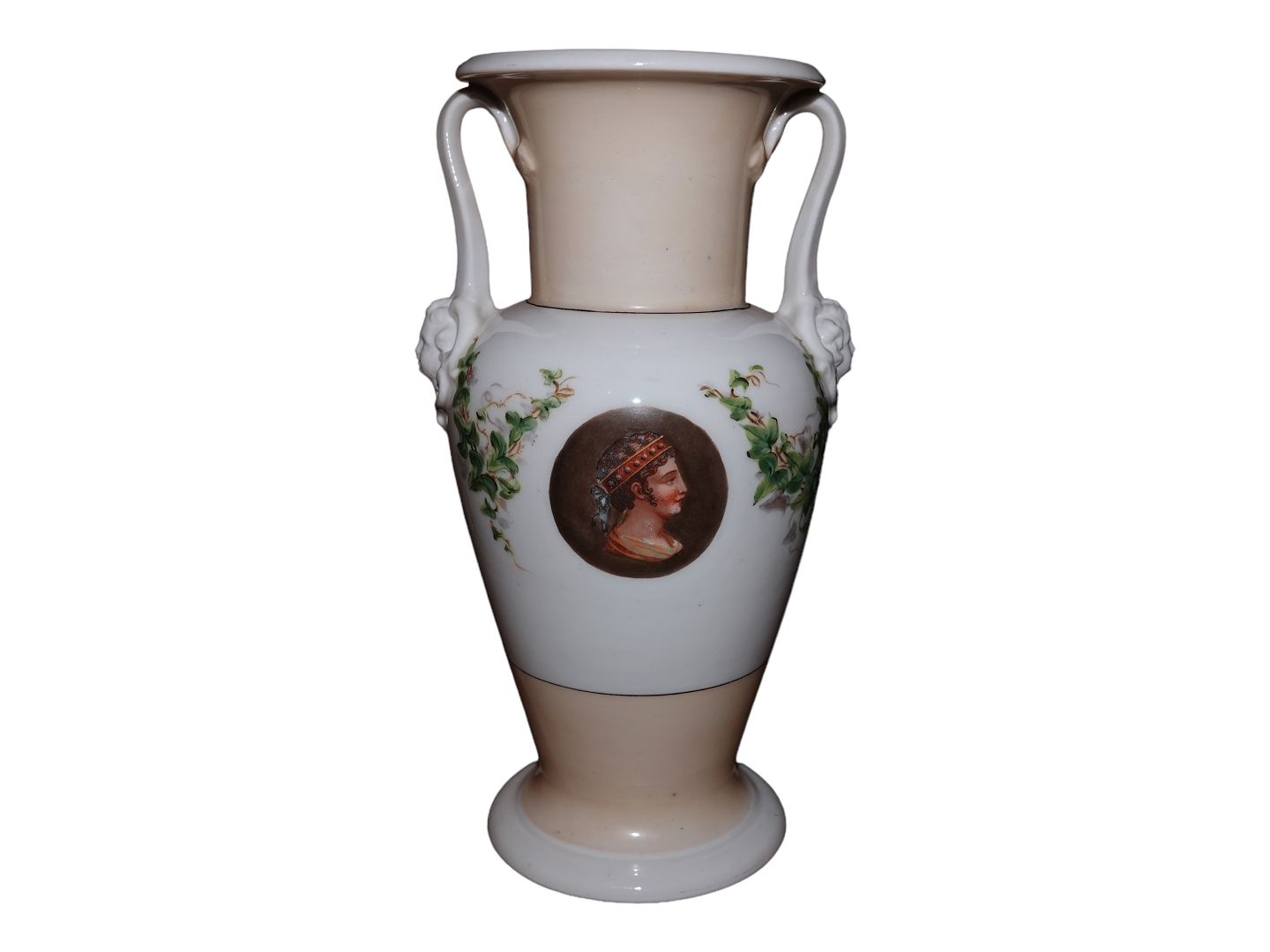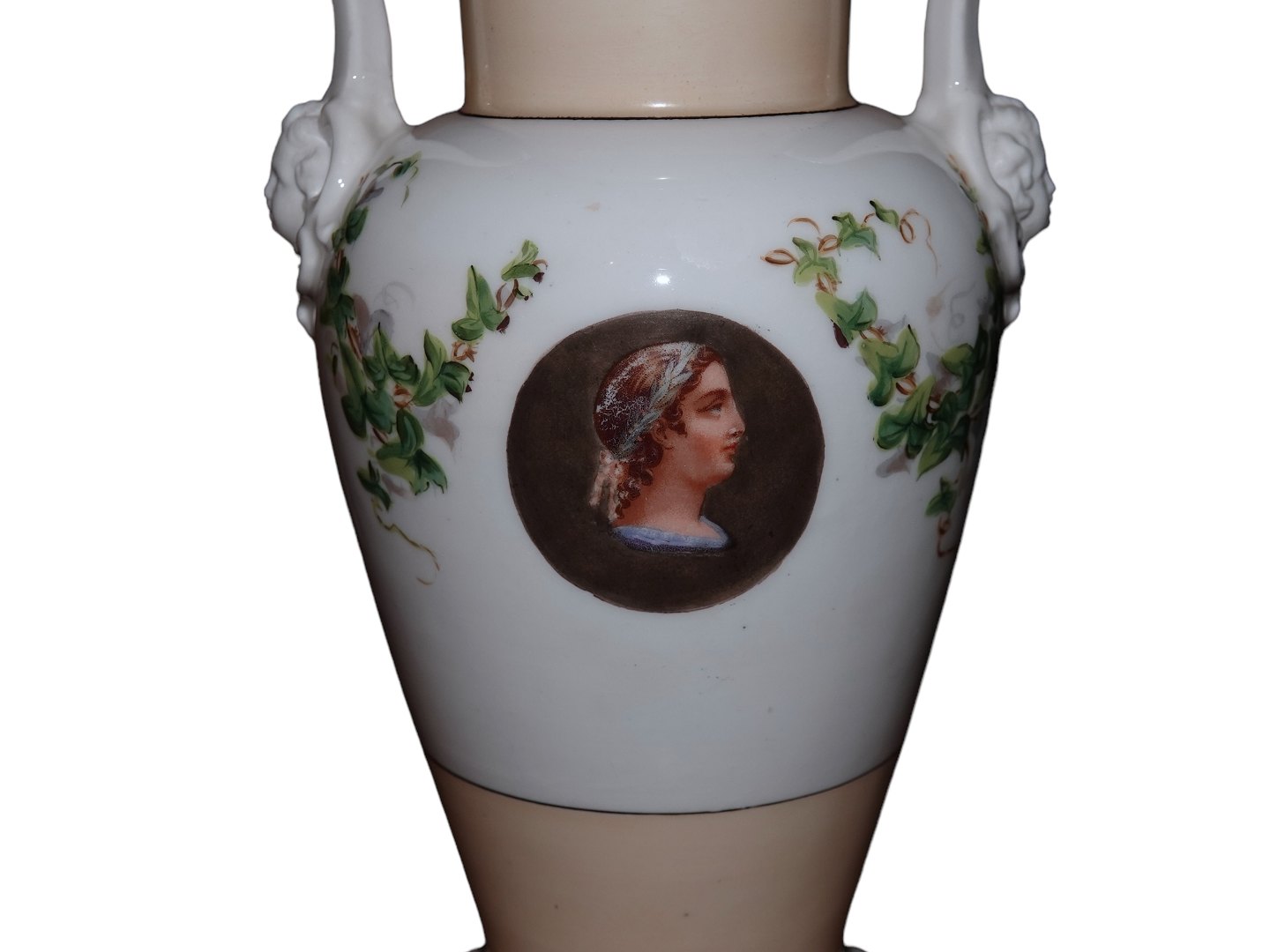 Antik Bing & Grøndahl vase med overglasur bemaling. Vasen er dekoreret med to dame portrætter og grøn efeu. Der er modulleret to ansigter ved hankene.