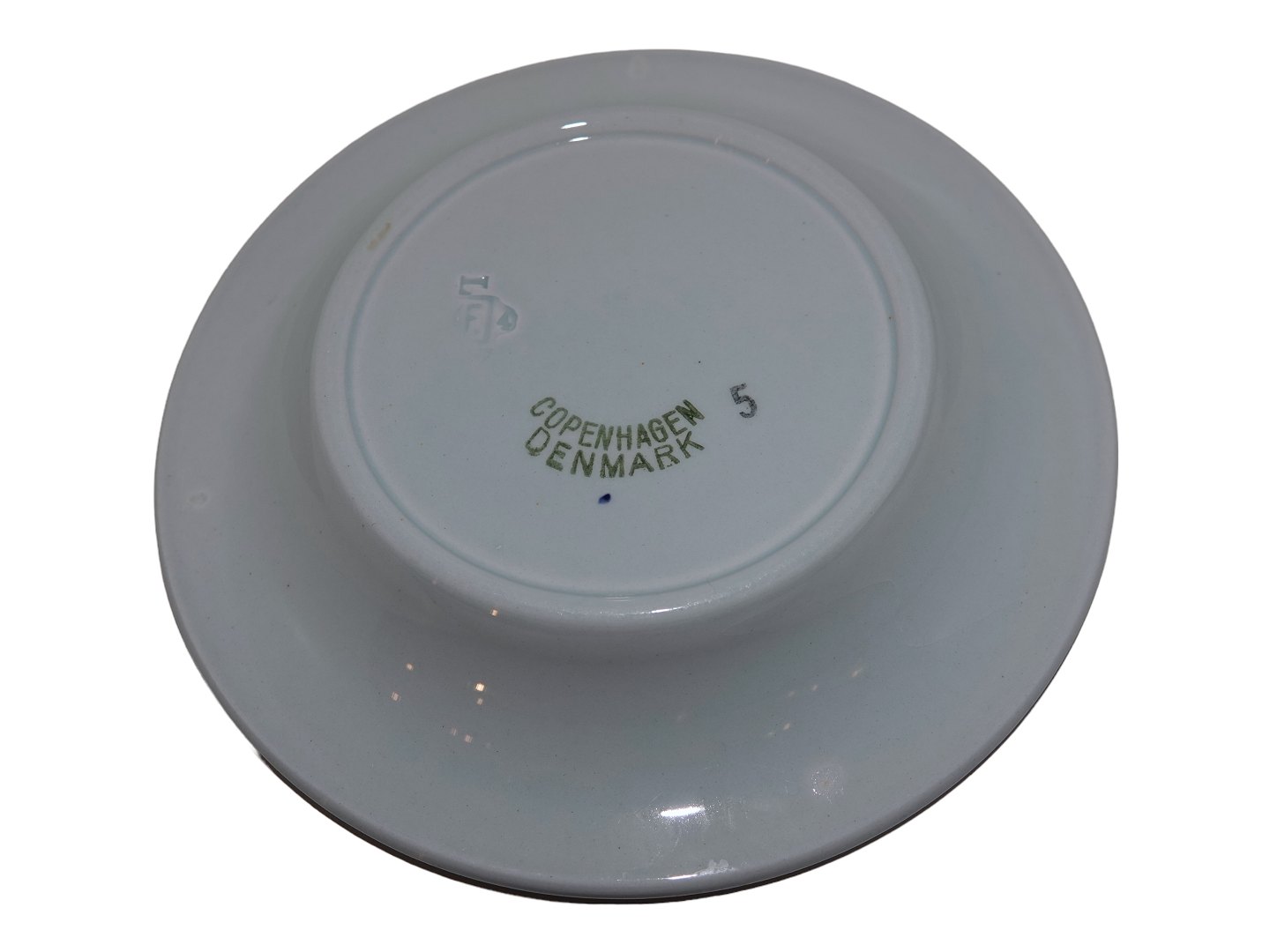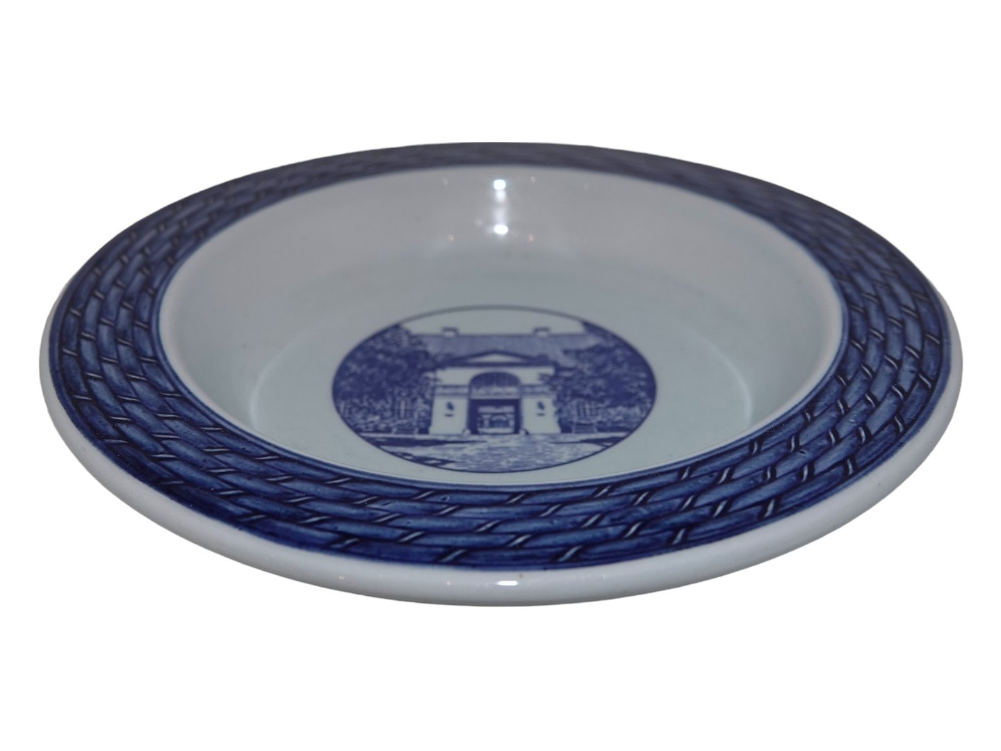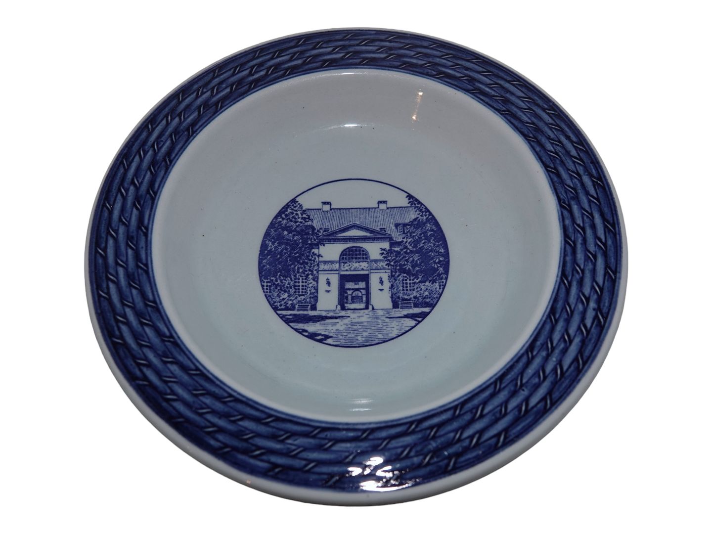 Aluminia Tranquebar, rund asiet med motiv af bygning. 1. sortering. Diameter 14,5 cm. Perfekt stand uden fejl.
