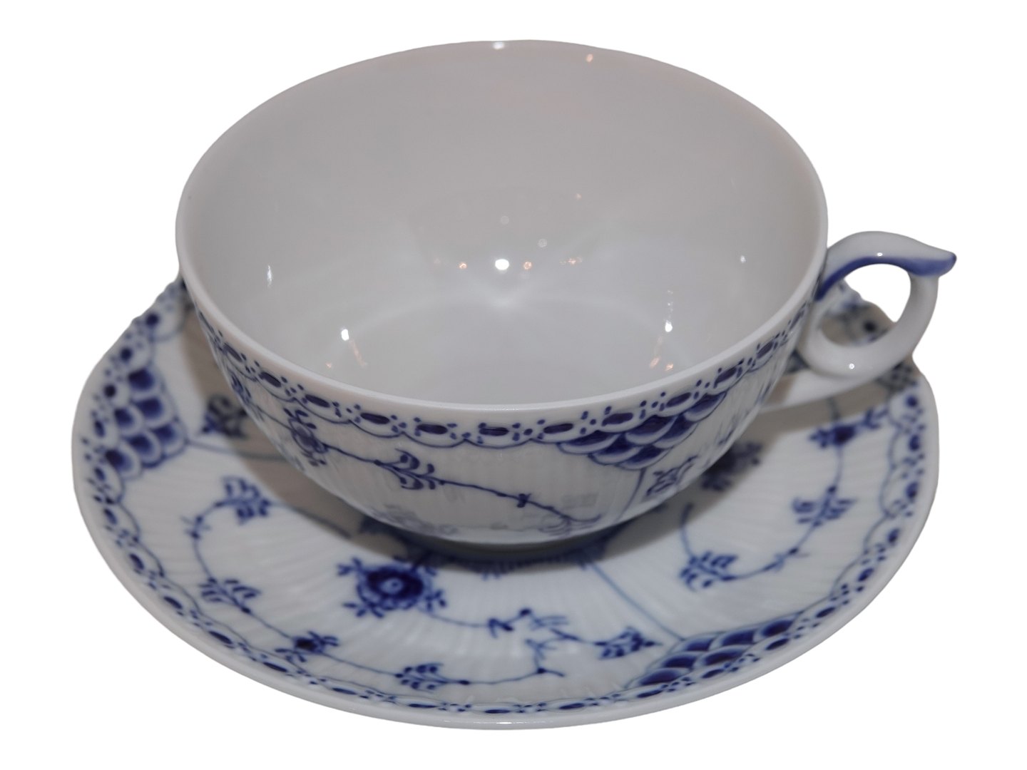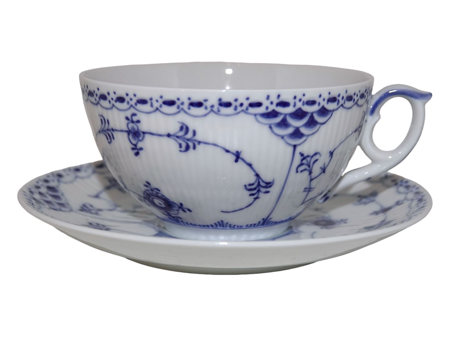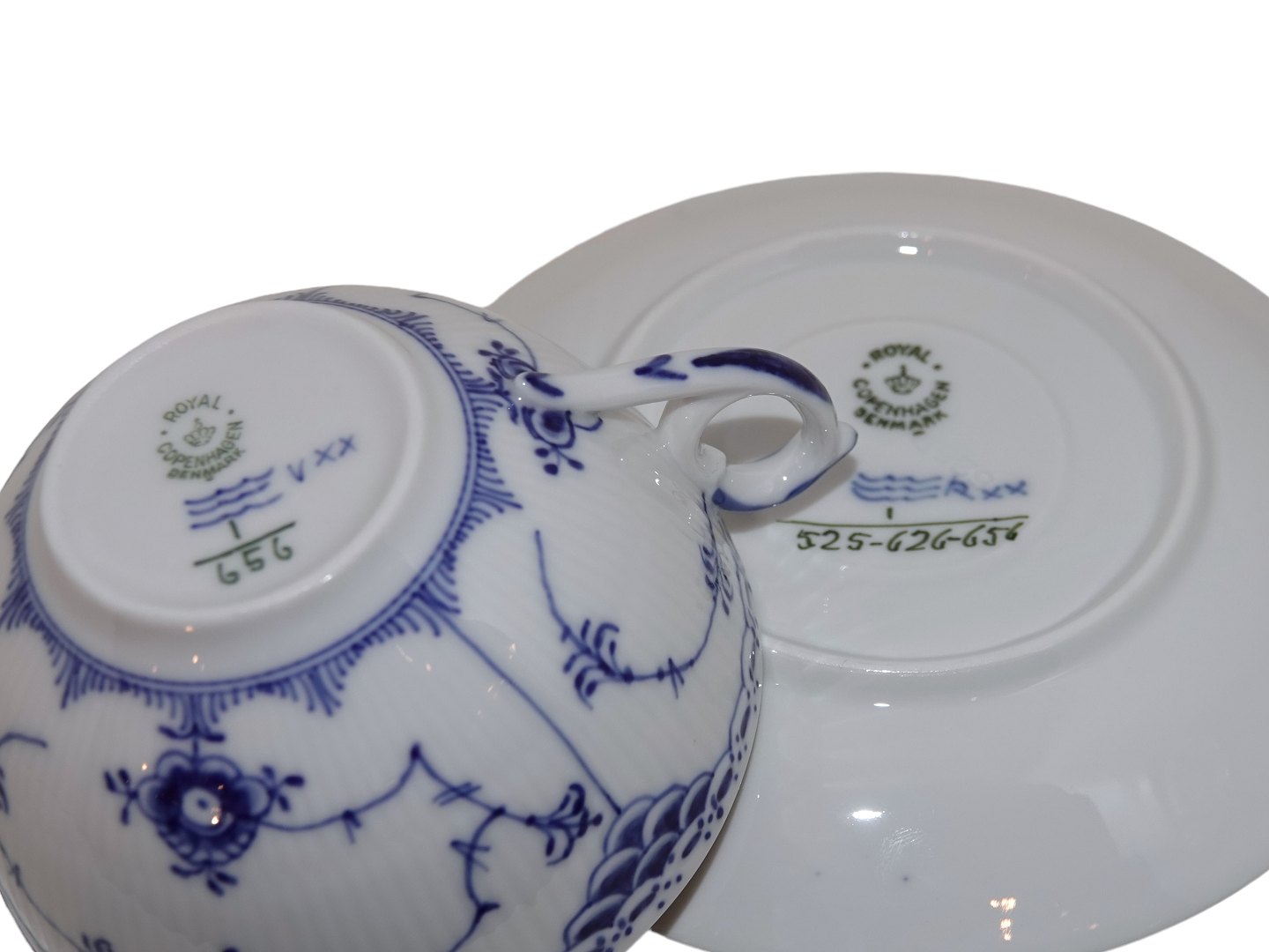 Royal Copenhagen Blue Fluted Half Lace, large tea cup with matching saucer. Decoration number 1/656. Factory first. The cup measures 10.5 cm. across, Perfect condition with no chips, cracks or repairs.