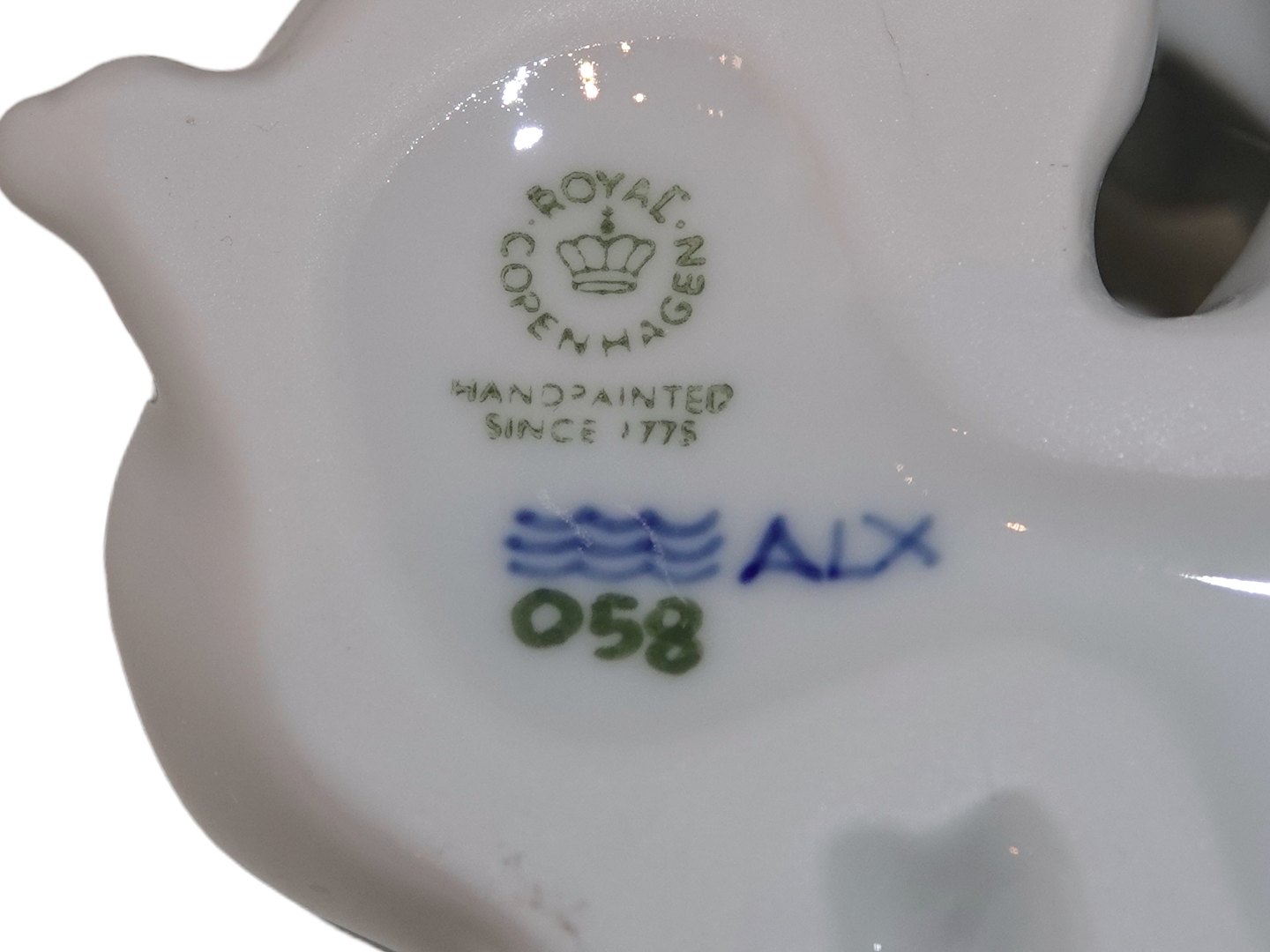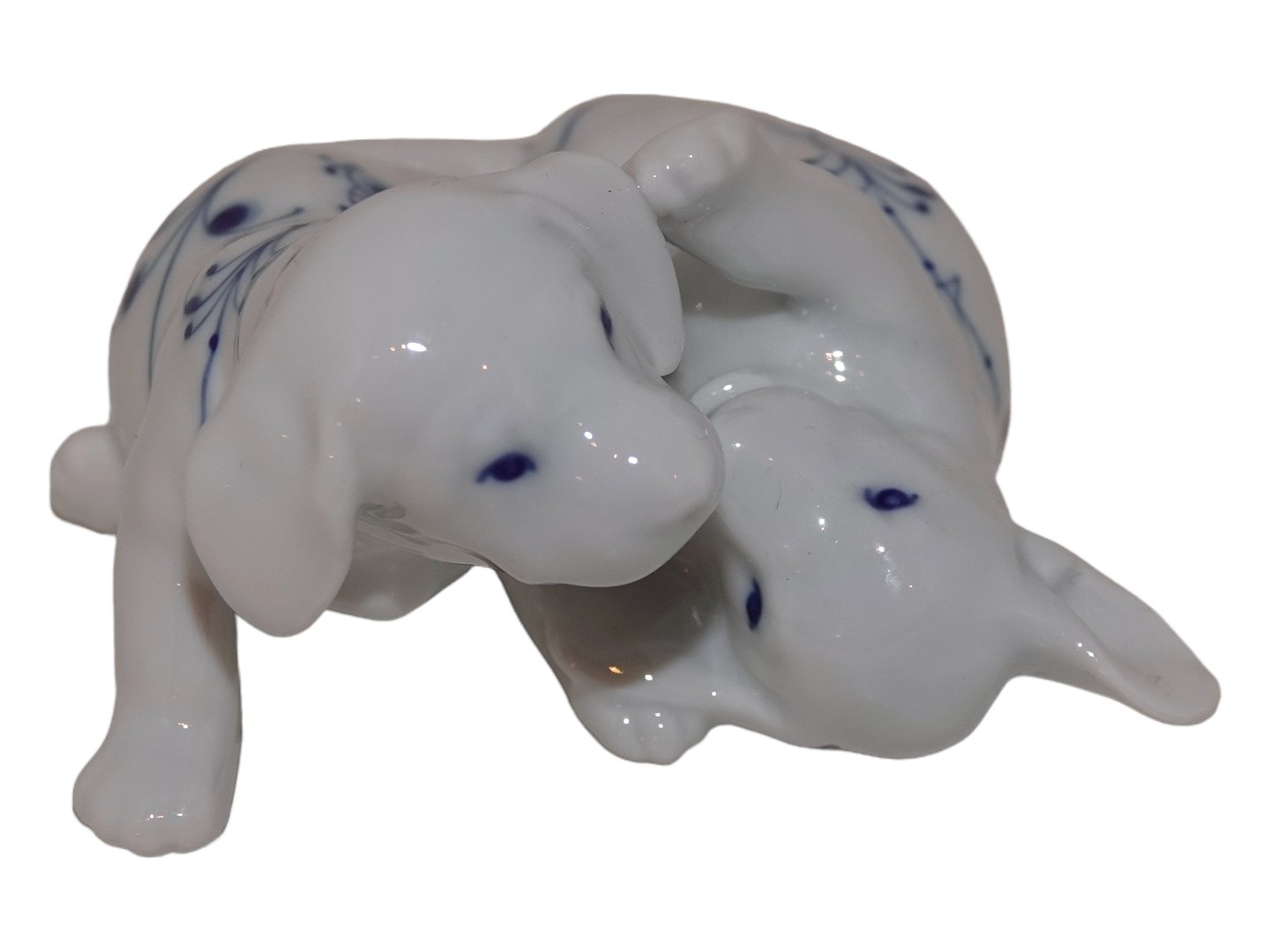 Royal Copenhagen Musselmalet Riflet, figur af to hunde. Dekorationsnummer 058. 3. sortering men solgt til blåmalerinde på fabrikken og flot eksemplar. Måler 9,5 x 9,0 cm. Perfekt stand uden fejl.